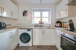 Textured ceiling, UPVC double glazed window to rear, modern wall, base and drawer units with work surface over, stainless steel sink and drainer inset, built-in oven with electric hob over, space for washing machine and fridge/freezer.