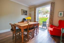 Smooth and coved ceiling with inset spotlights, double glazed French doors opening into garden, vertical open column radiator, laminate floor.