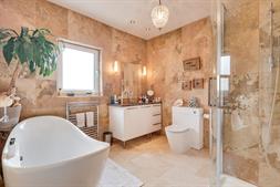 Smooth finish to ceiling with inset spotlights, double glazed window to rear elevation, four piece suite comprising low level WC, wash hand basin, corner shower cubicle with mains fed rainfall shower over, free standing statement bath with free standing controlled tap, utility cupboard with plumbing for washing machine, feature heated towel rail and additional ladder towel rail, fully tiled in natural travertine with electric underfloor heating.