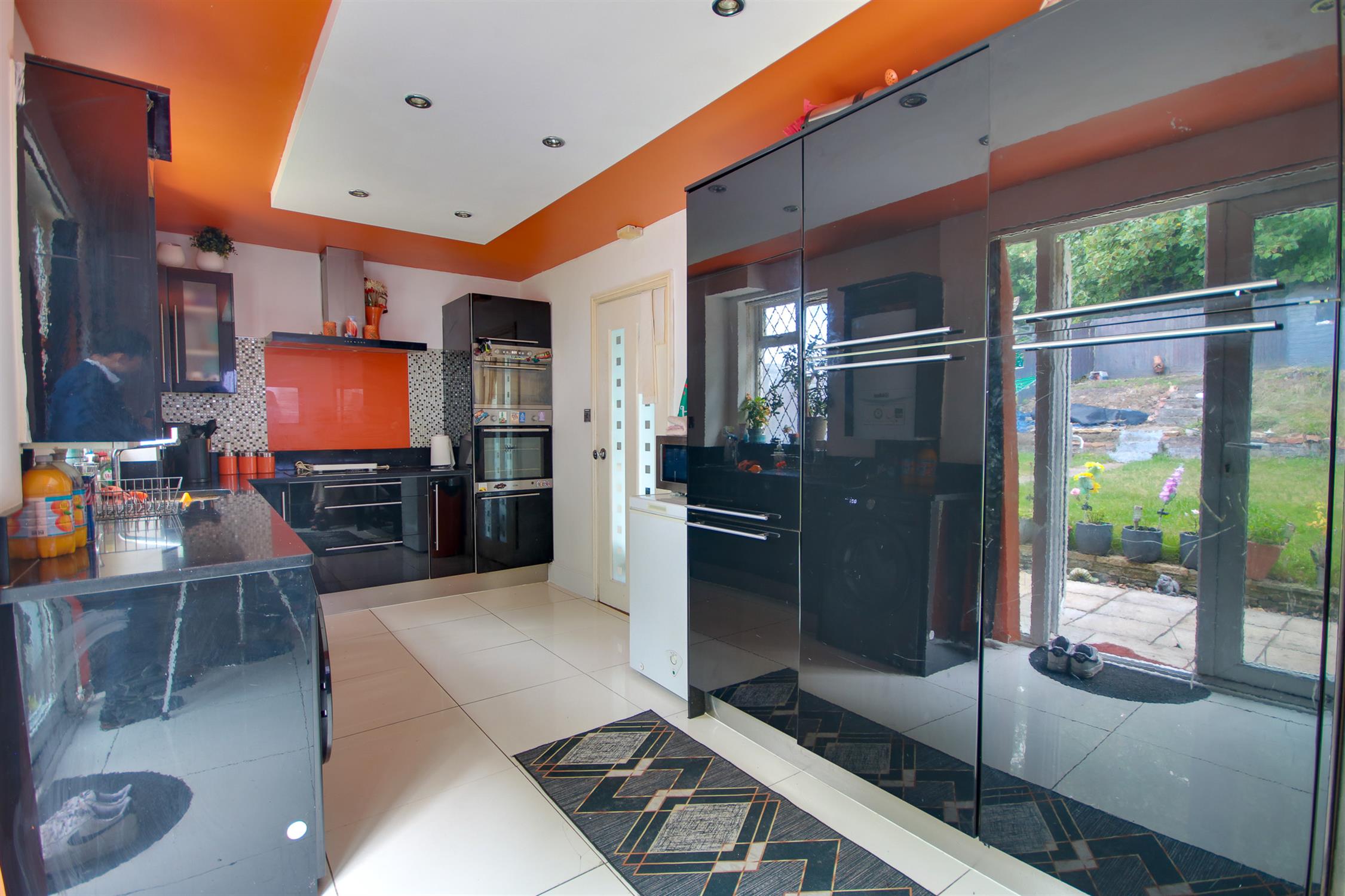 Smooth ceiling with spotlights inset, double glazed window to rear, double glazed French doors to rear leading into garden range of wall, base and drawer units with work surface over, bowl and a half sink and drainer inset, wall-mounted boiler, space for washing machine, built-in oven and hob with extractor over, integrated fridge/freezer and dishwasher, breakfast bar, vertical radiator