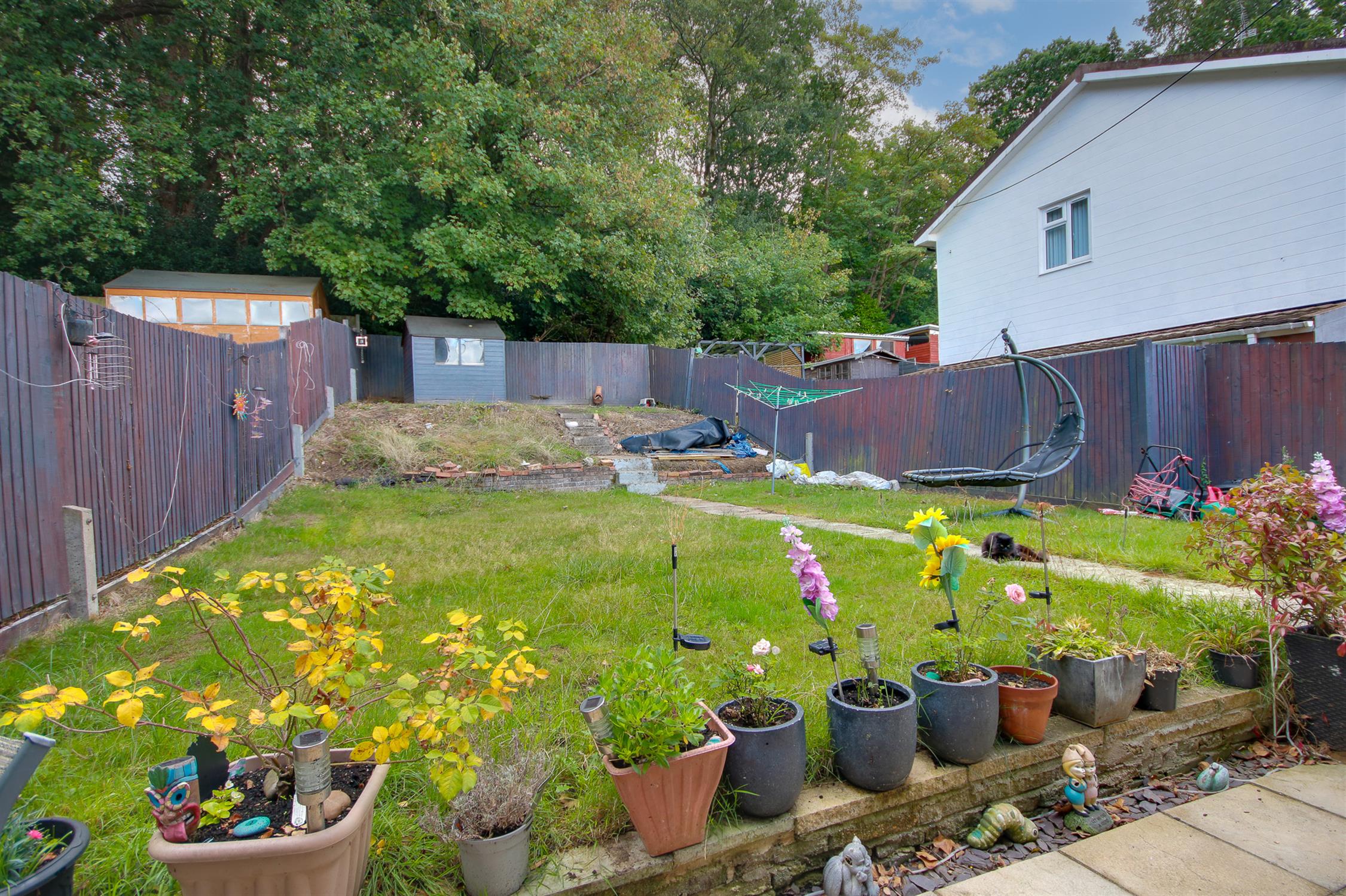 Fence enclosed rear garden, patio seating area, mainly laid to lawn, side pedestrian access.