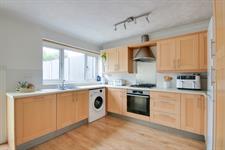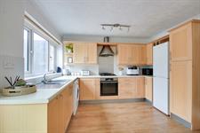 Coved and textured ceiling, UPVC double glazed window and patio door to rear. Modern wall, base and drawer units with work surface over, stainless steel bowl and a half sink and drainer inset, built in oven with gas hob and extractor over, integral dishwasher, space for washing machine and fridge/freezer. Tiled splash backs. Under stairs strorage.