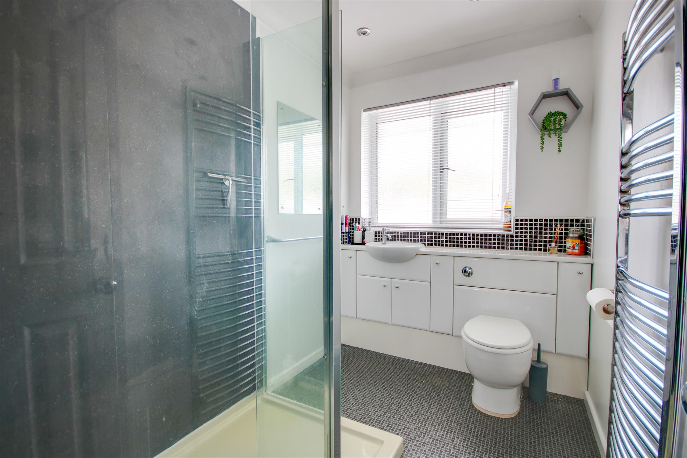 Smooth and coved ceiling with inset spotlights, UPVC double glazed obscured window to rear. Three piece suite comprising WC, wash hand basin and double shower cubicle with mains fed shower over. Heated ladder towel rail.
