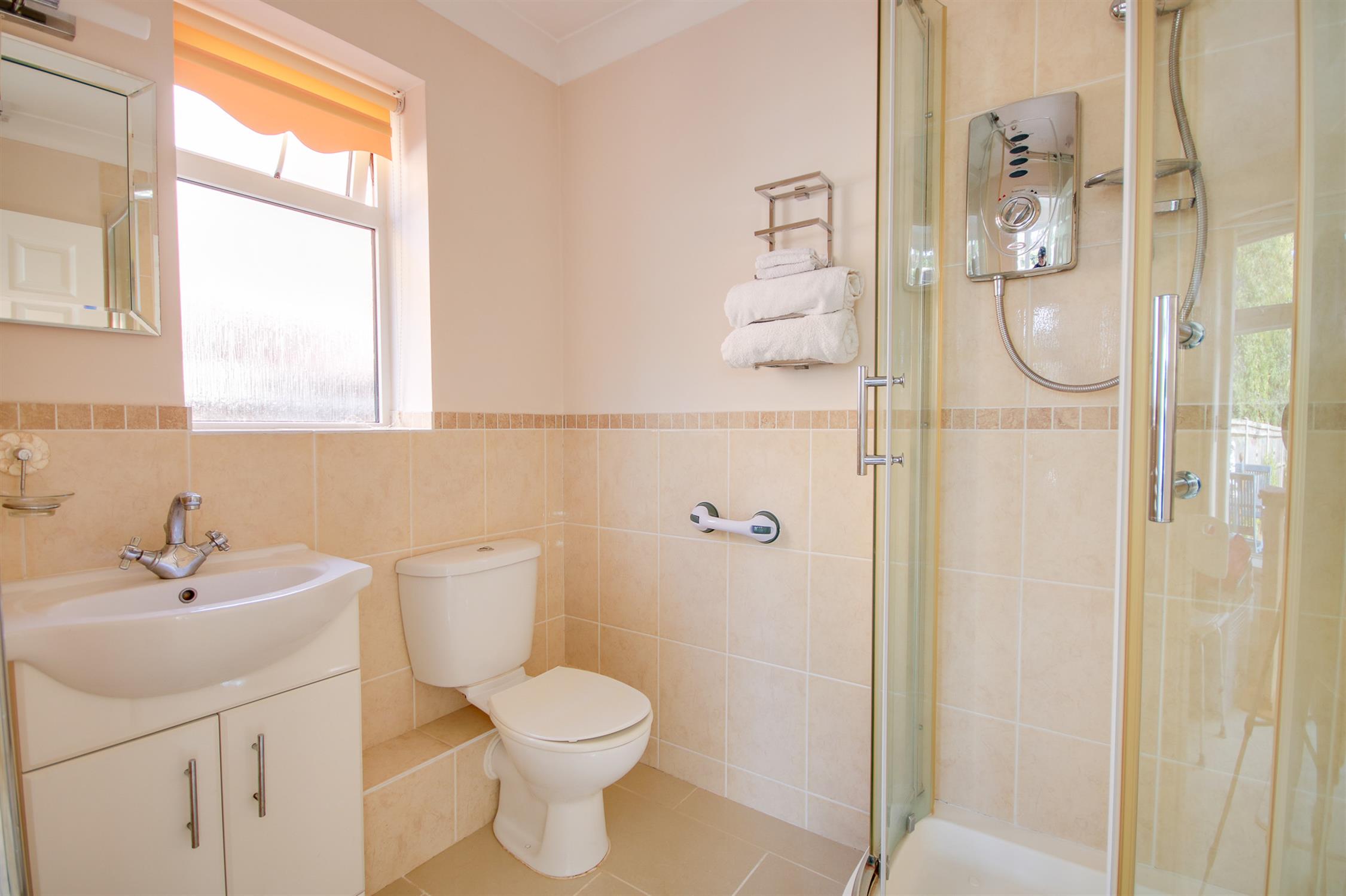 Ceramic floor and wall tiling, WC, wash hand basin, corner cubicle with mains shower and glass sliding doors, heated chrome, window to side, smooth and coved ceiling.