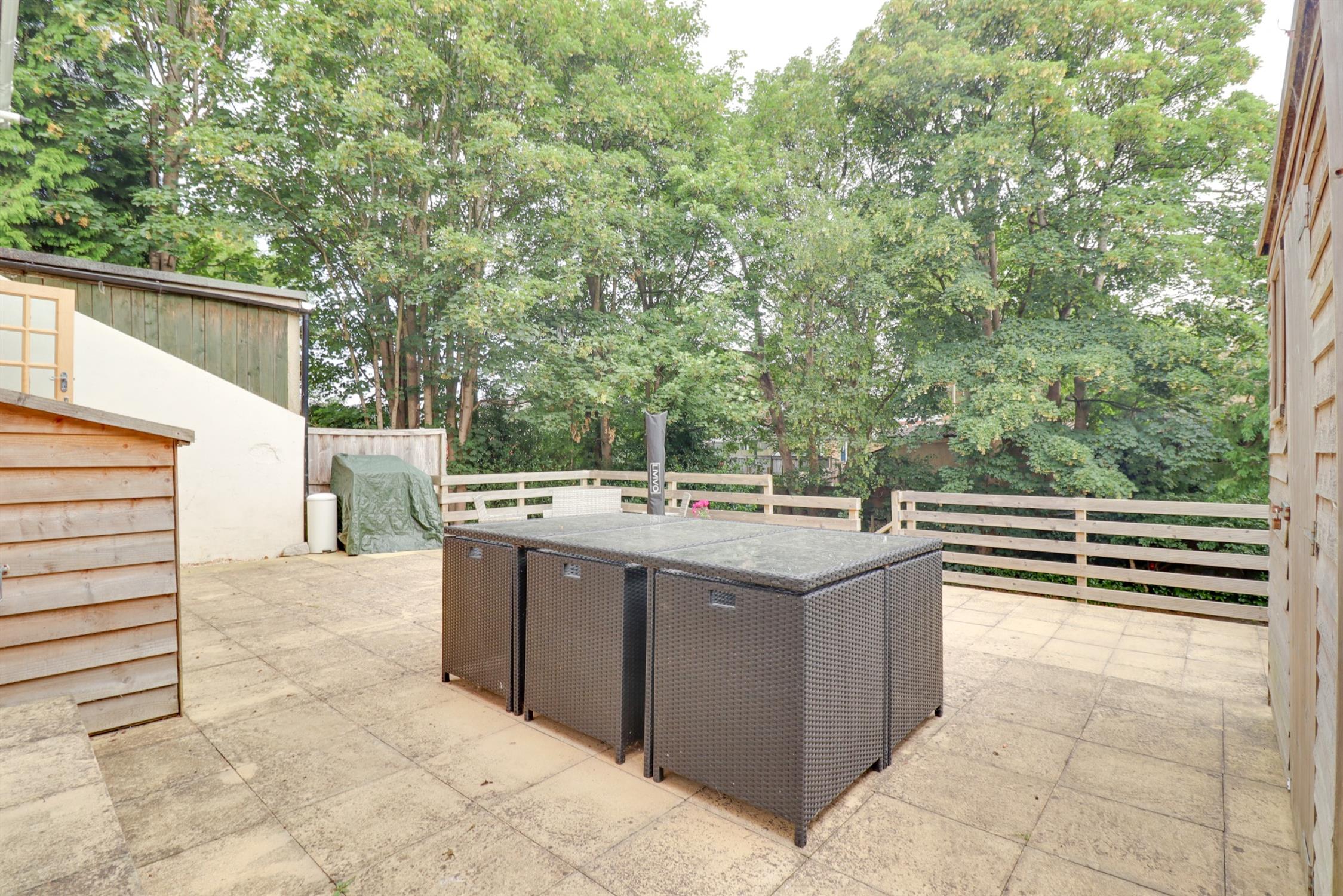 The garden consists of three tiers. There is a generous patio seating area with steps down to a luscious lawn and further steps to mature trees/shrubs.