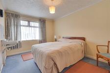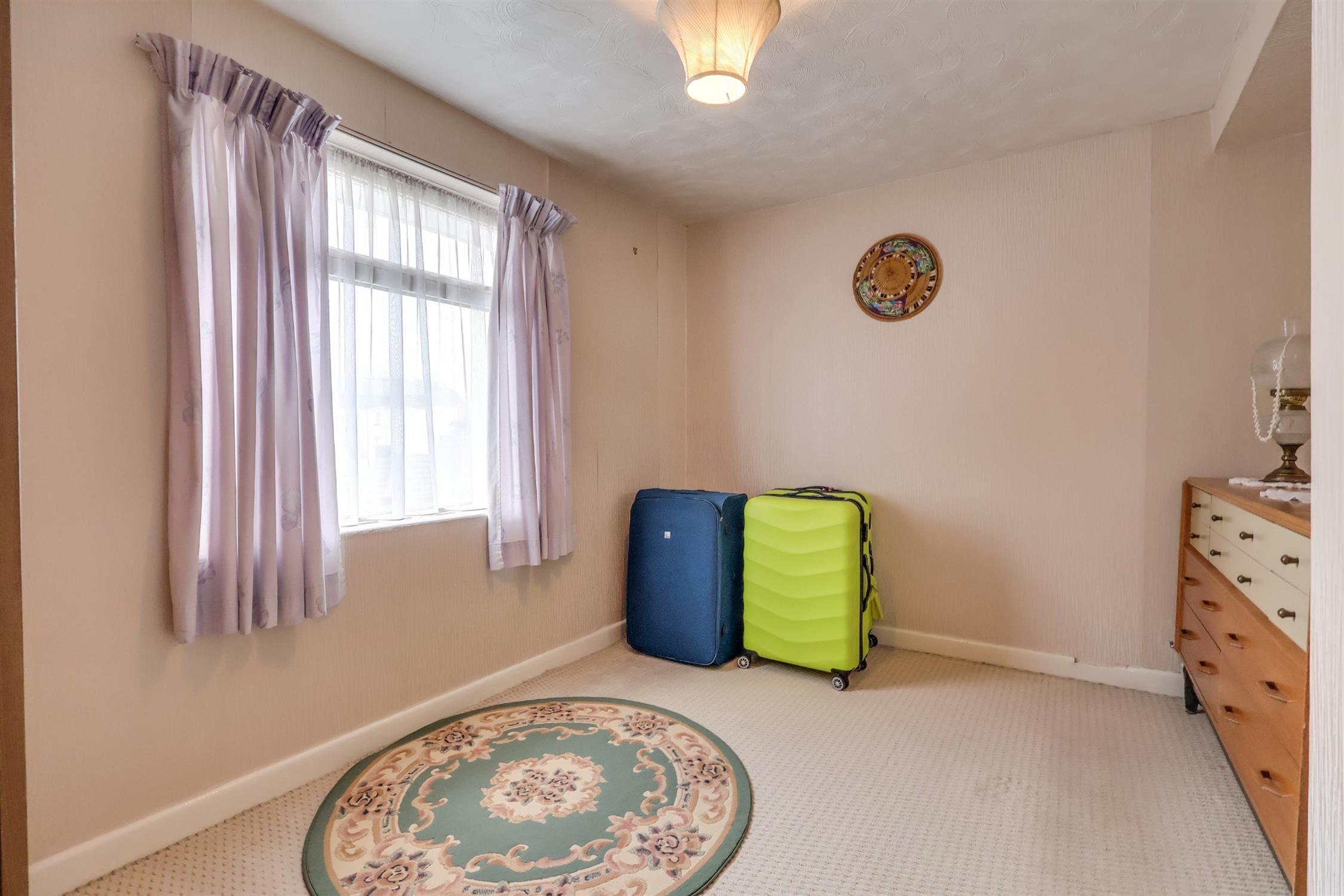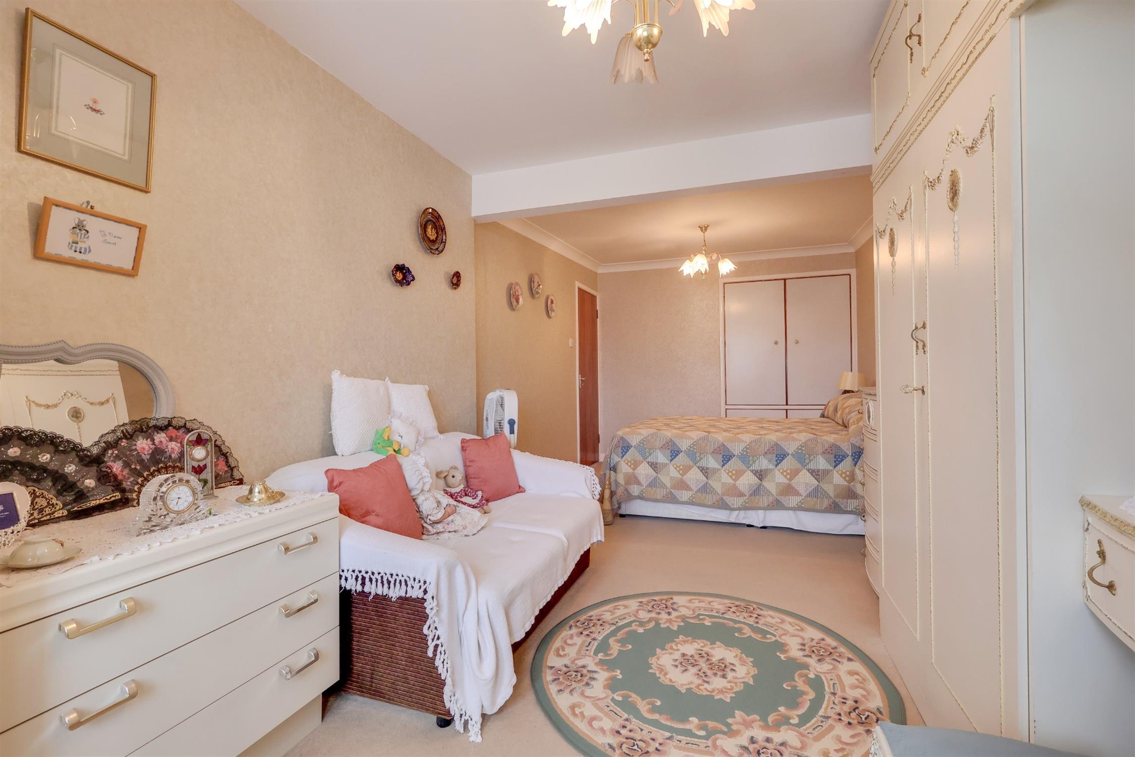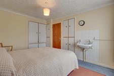 Textured finish to coved ceiling, double glazed window to front elevation, wash hand basin with tiled splashbacks, airing cupboard, built in storage.