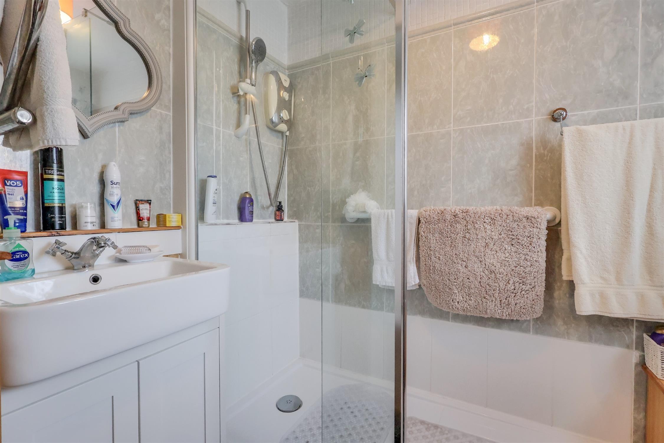 Textured finish to ceiling, window to front elevation, walk in shower with electric shower over, vanity wash hand basin, low level WC, heated ladder towel rail, fully tiled.