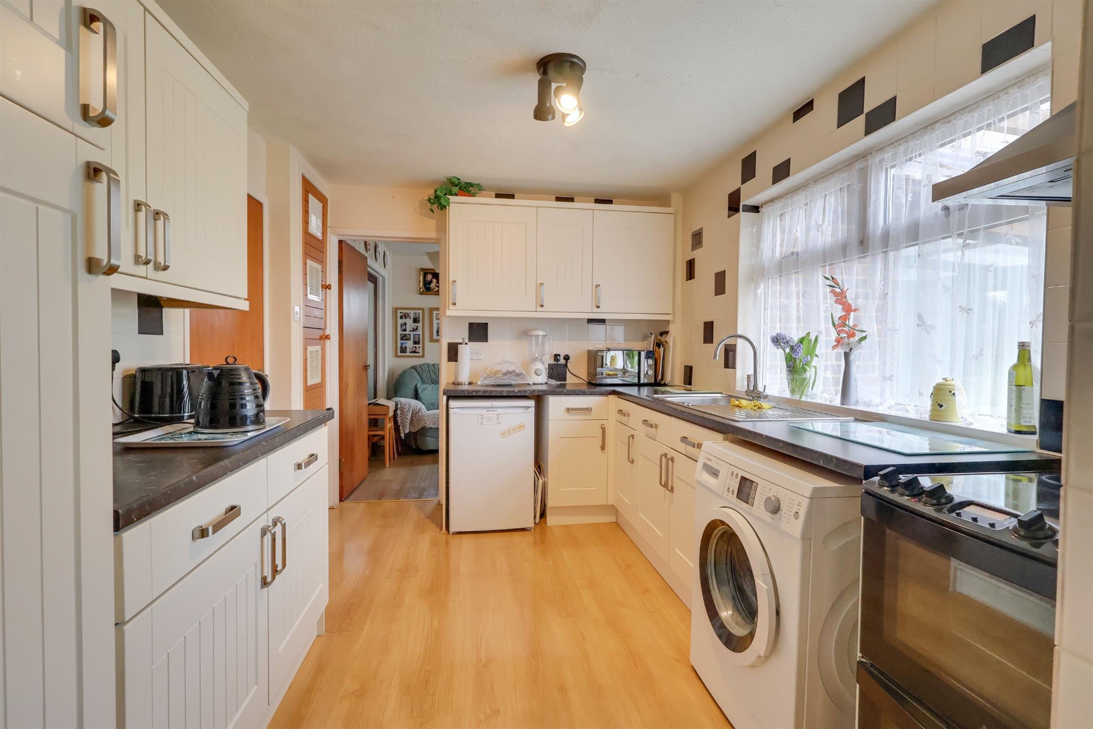 Textured finish to ceiling, door and window to rear elevation, double glazed door to front elevation, built in storage, space for appliances, door to garage, door to: