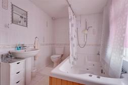 BathroomTextured finish to ceiling, double glazed window to front elevation, large jacuzzi bath with electric shower over, low level WC and wash hand basin, built in storage, heated ladder towel rail, fully tiled.