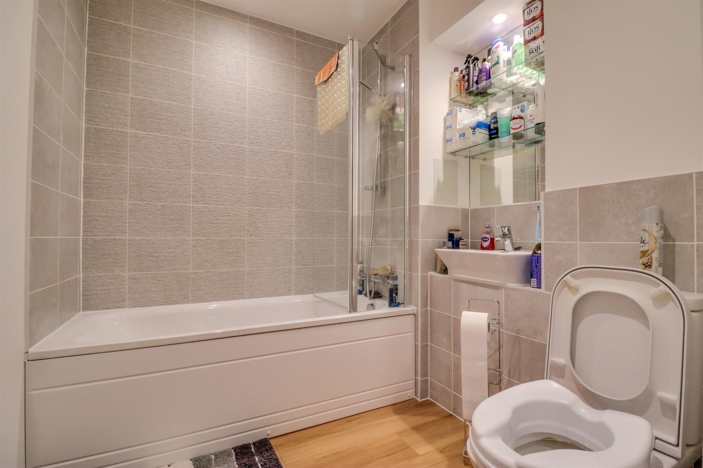Smooth finish to ceiling, inset spotlights, panel enclosed bath with shower attachment over, hand wash basin and low level WC, heated towel rail, tiling in principle areas.