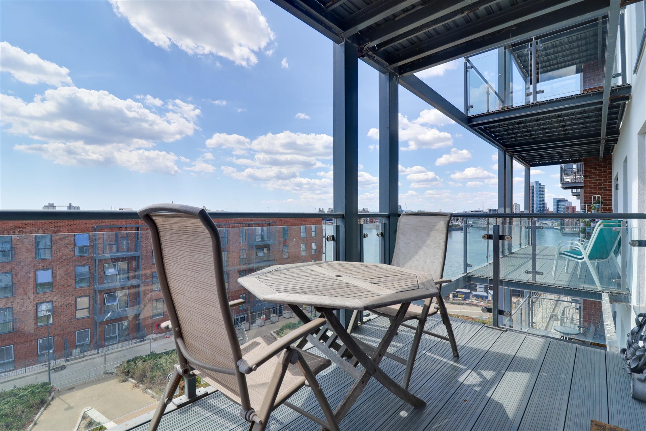 Glass surround, decked floor, space for table & chairs, views of Southampton Water & Ocean Village.