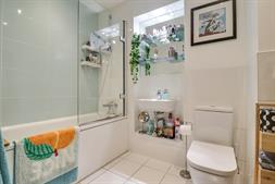 BathroomSmooth finish to ceiling with inset spotlights, modern three piece suite comprising panel enclosed bath with shower attachment over, wash hand basin and low level WC, heated ladder towel rail, tiling to principle areas and flooring.