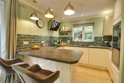Smooth finish to coved ceiling, double glazed windows to side elevation, double glazed French doors to rear elevation, range of matching wall base and drawer units with roll top work surface over, one and a half sink and drainer inset, integrated oven, microwave, dishwasher, fridge, freezer and hob with extractor fan over, tiled splashbacks, electric heater, laminate flooring.