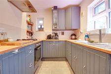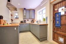 Smooth ceiling, UPVC double glazed window to rear and side, a range of wall, base and drawer units with work surface over, stainless steel sink and drainer inset, integrated gas hob and electric oven with extractor over, door to: