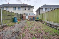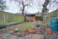 Wall and fence enclosed rear garden, gated pedestrian side access, mainly laid to lawn, raised flower beds, shed.