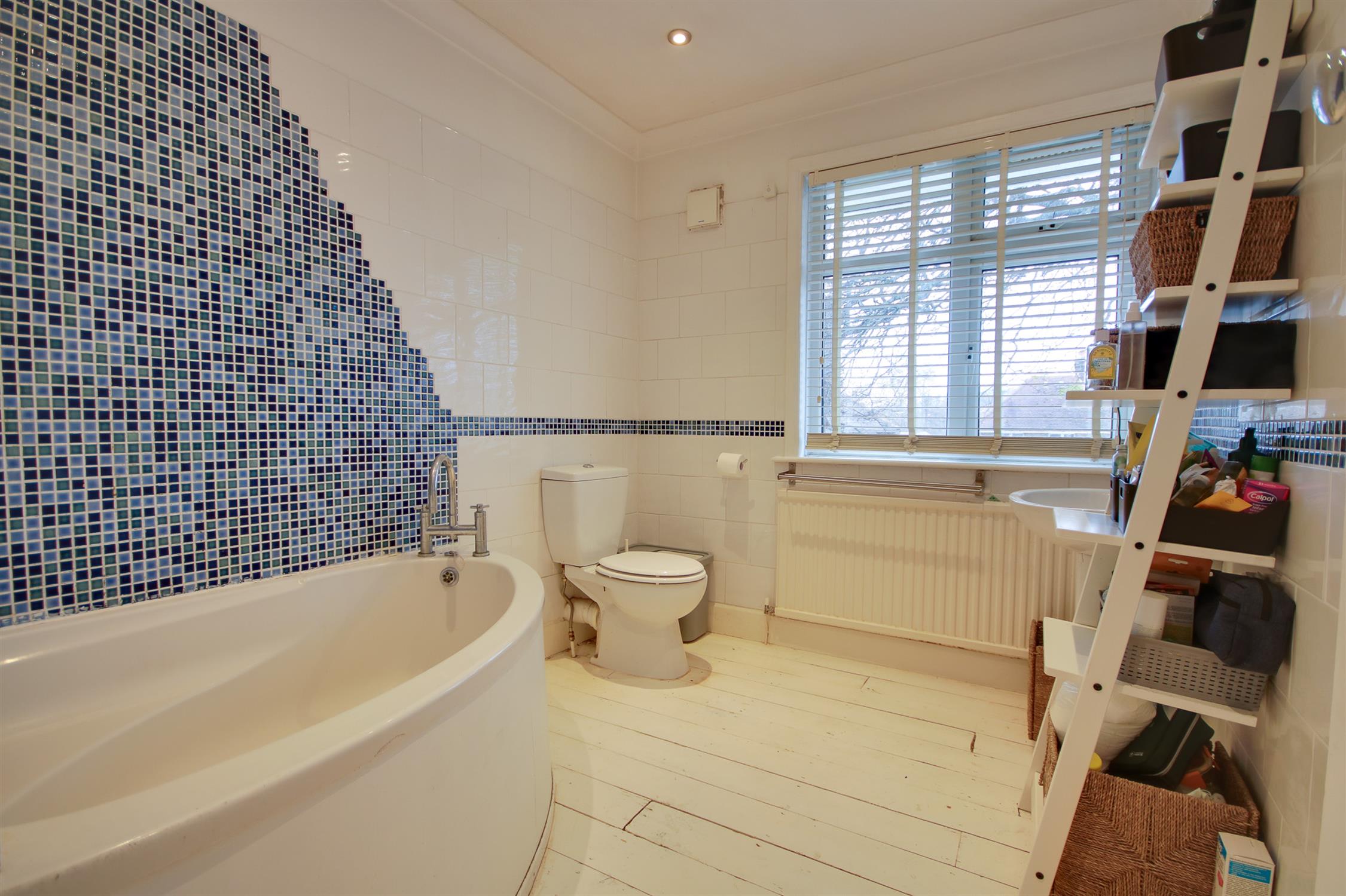 Smooth and coved ceiling with spotlights inset, UPVC double glazed window to rear, tiled walls, three-piece suite comprising: panel enclosed bath, wash hand basin and WC, radiator.