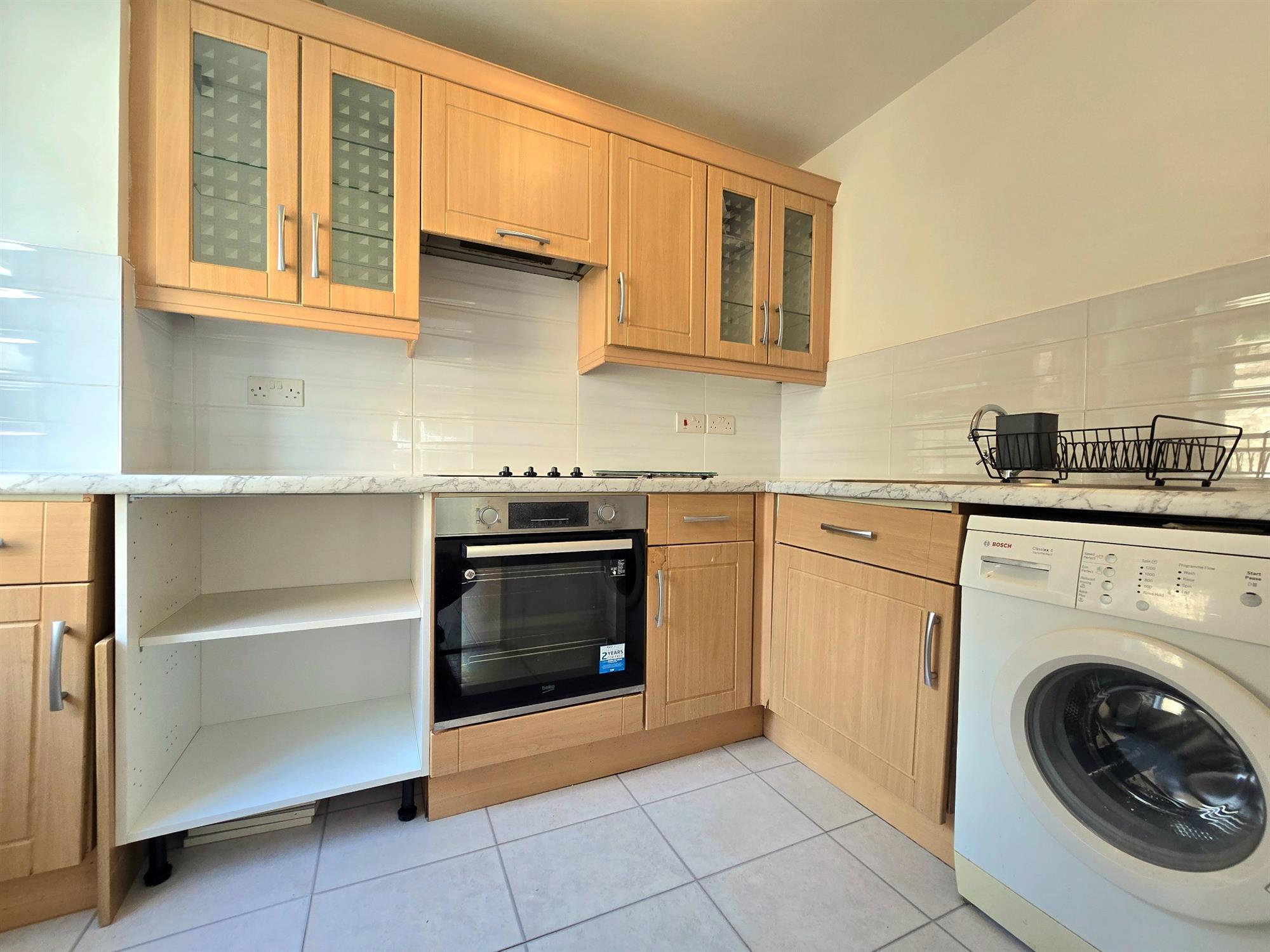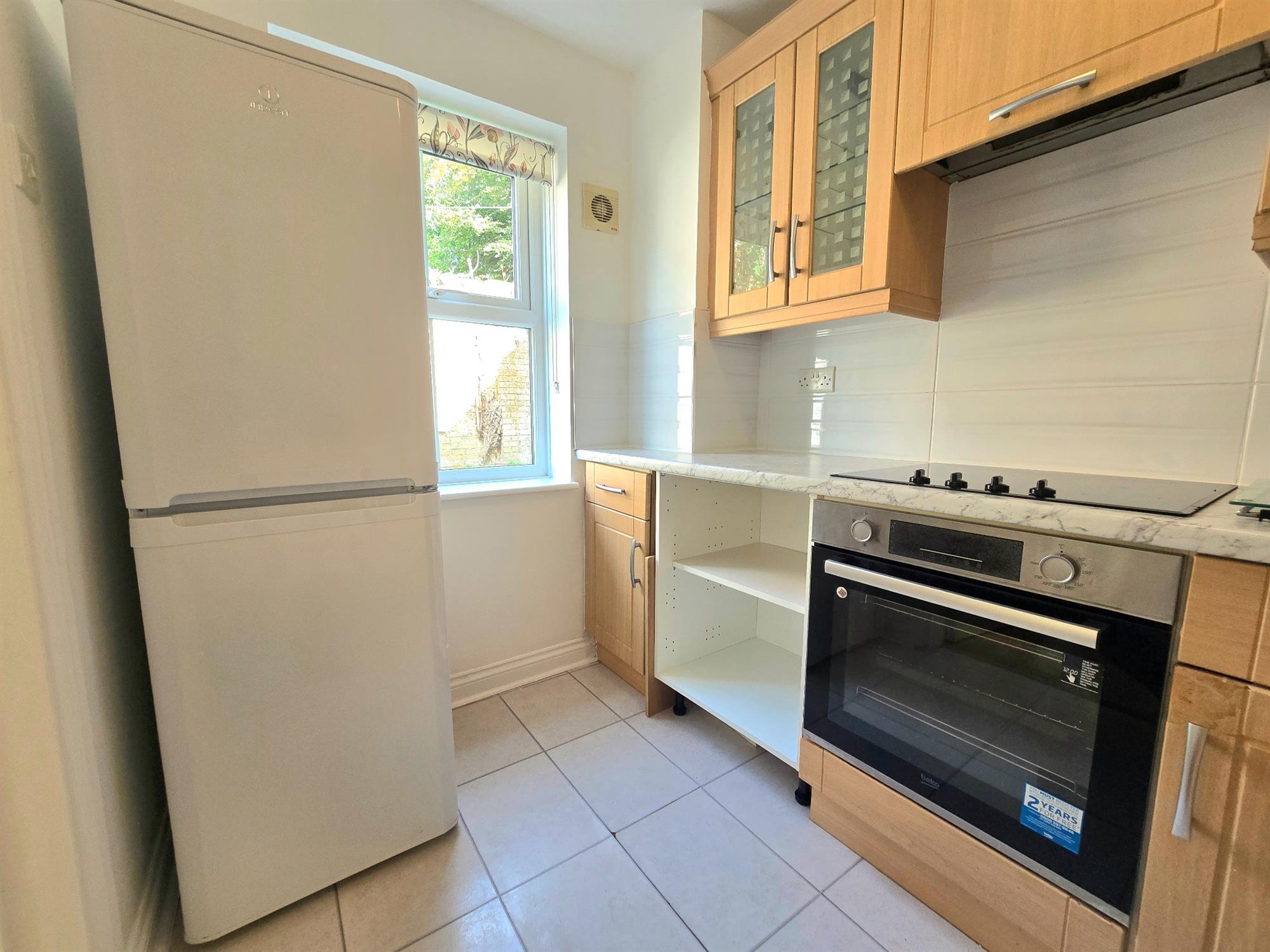 KITCHEN - Fitted kitchen with electric cooker and hob, under-counter washing machine and freestanding fridge/freezer.