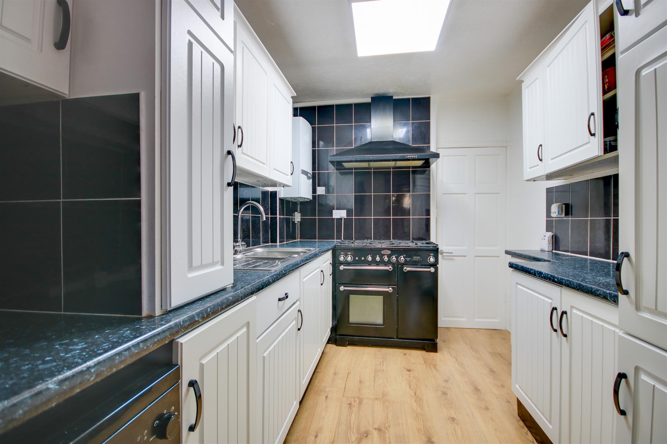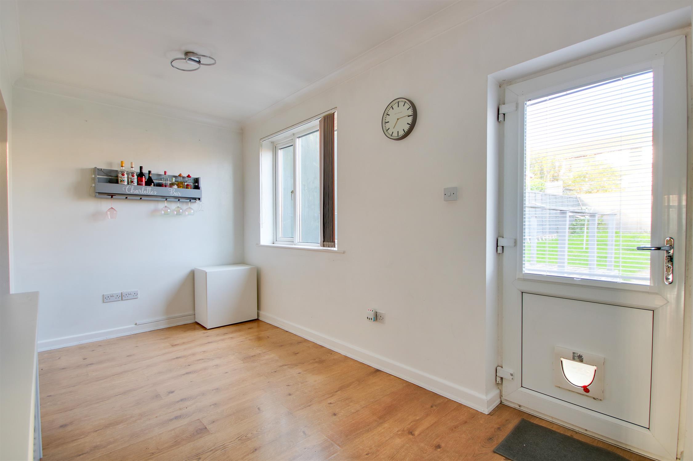 Smooth and coved ceiling, UPVC double glazed window to rear and UPVC double glazed door to rear opening onto garden, space for fridge/freezer and slimline dishwasher with work surface over, door to: