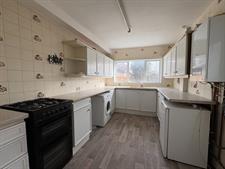 Base and wall mounted cupboards, rolled edge work surfaces, inset sink unit, tiled splashback, space for appliances, radiator, wall mounted gas central heating boiler, double glazed window to rear elevation, double glazed door to garden.