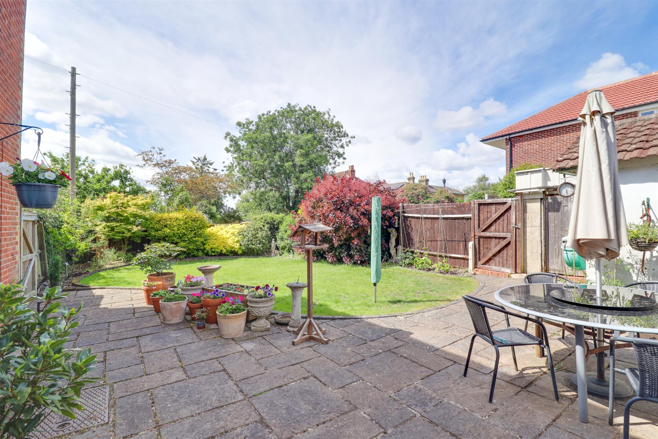 Mainly laid to lawn with a mature shurb border, generous patio seating area, gated access to a driveway for multiple vehicles.