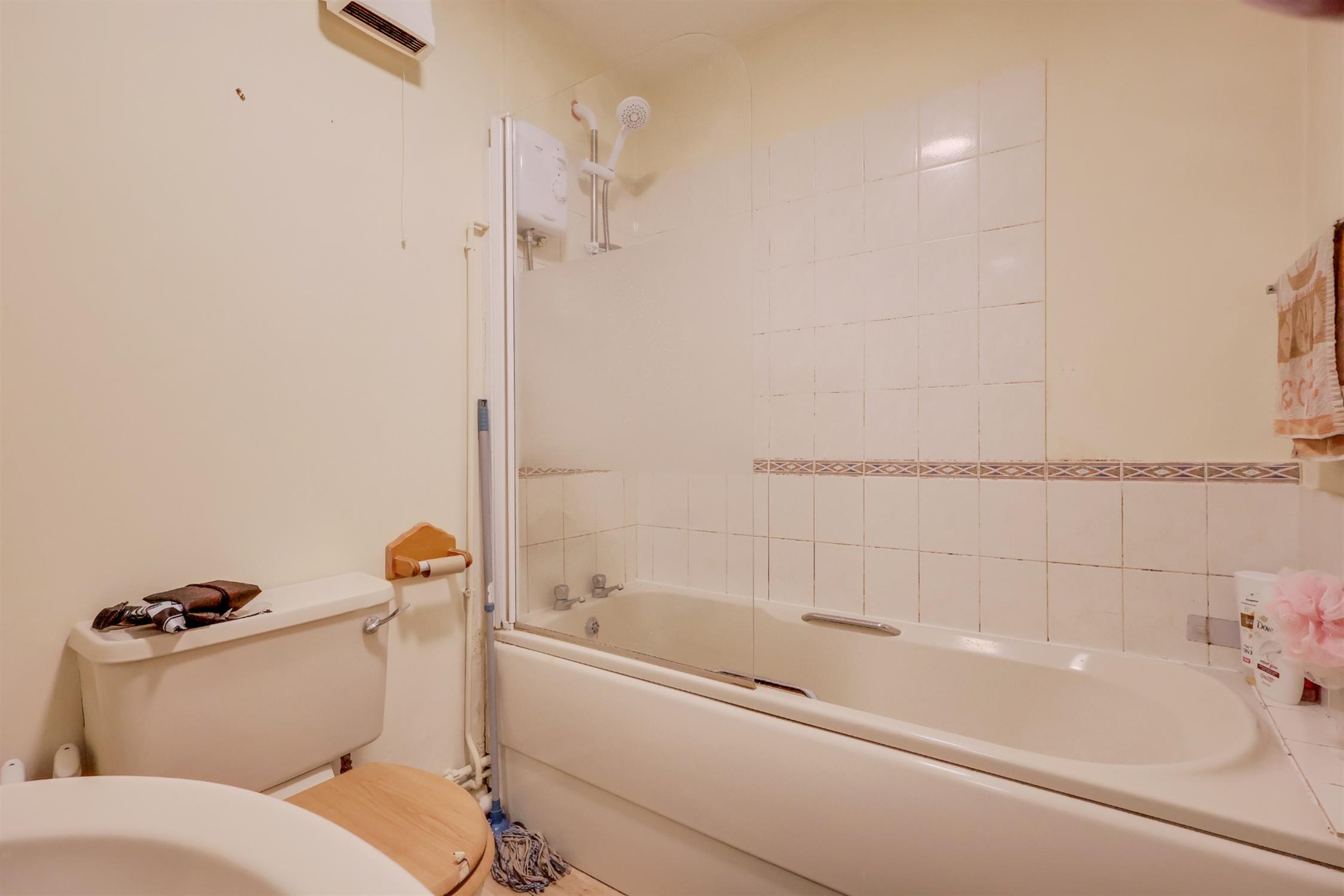 Textured finish to ceiling with extractor fan, panel enclosed bath with electric shower over, wash hand basin and low level WC, tiling to principle areas.