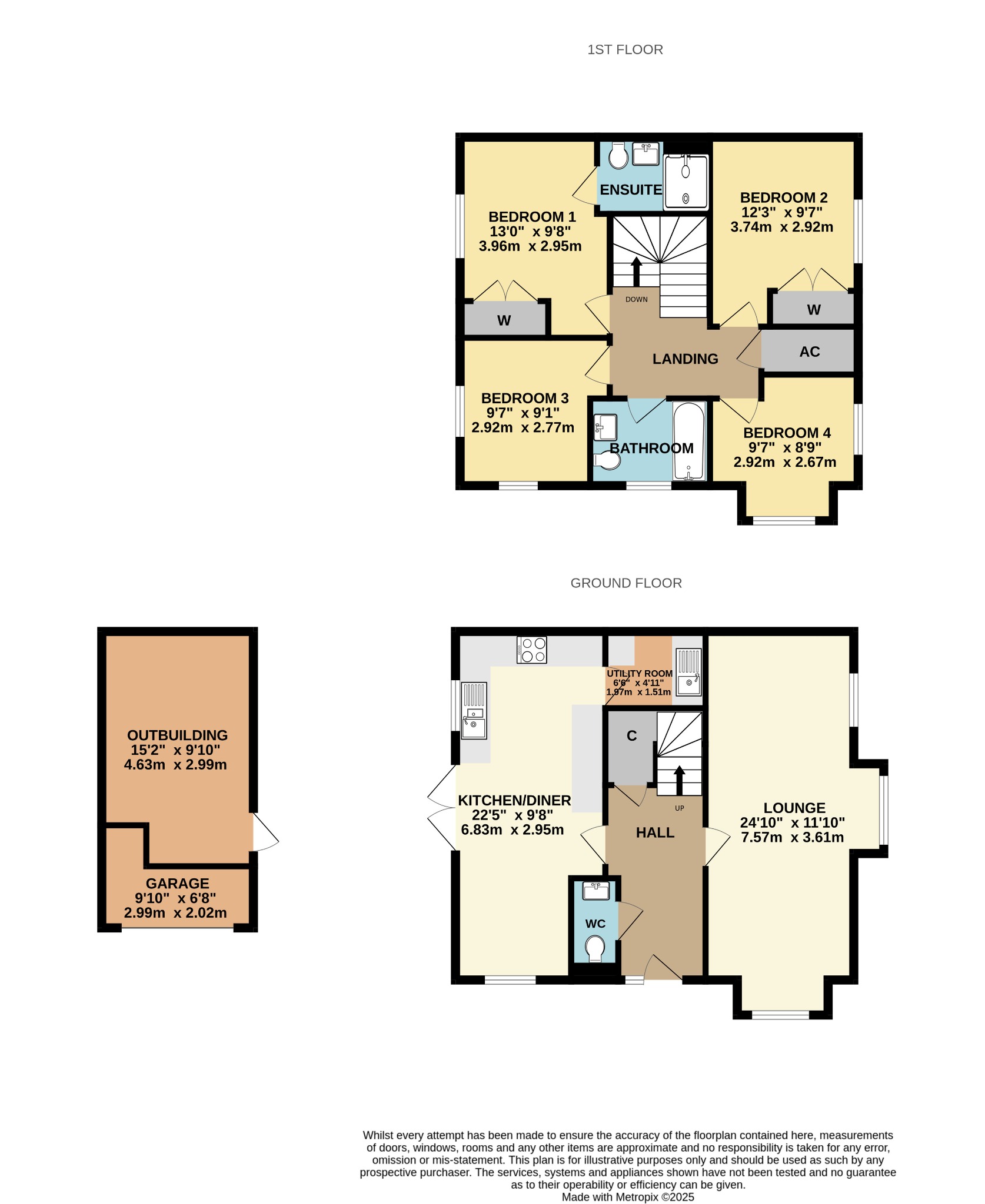 On the first floor, there is an impressive master bedroom suite which is complemented with a double built in wardrobe and a modern en suite shower room with a rainfall style shower, illuminated mirror and a heated towel rail. There are three further bedrooms, one of which benefits from a double built in wardrobe, another two benefit from dual aspect windows. There is a spacious hallway with a generous boiler cupboard and loft access to the loft. A modern family bathroom which has been designed with a 'P' shaped bath, rainfall style shower and a sleek vanity hand wash basin. Situated on a corner plot, the property benefits from a generous block paved driveway which provides ample off-road parking. An outbuilding with power and lighting provides additional entertaining space, and a small garage with an up-and-over door offers extra storage. To top it all off, there is a brick wall enclosed garden which offers a generous patio seating area and an area of artificial lawn, perfect for gatherings and al fresco dining. Side pedestrian access and direct access to the garage via a double-glazed door.