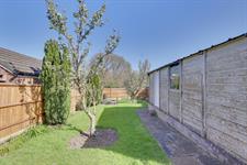 Fence enclosed rear garden mainly laid to lawn with patio seating area, mature trees and shrub borders, opening to driveway.