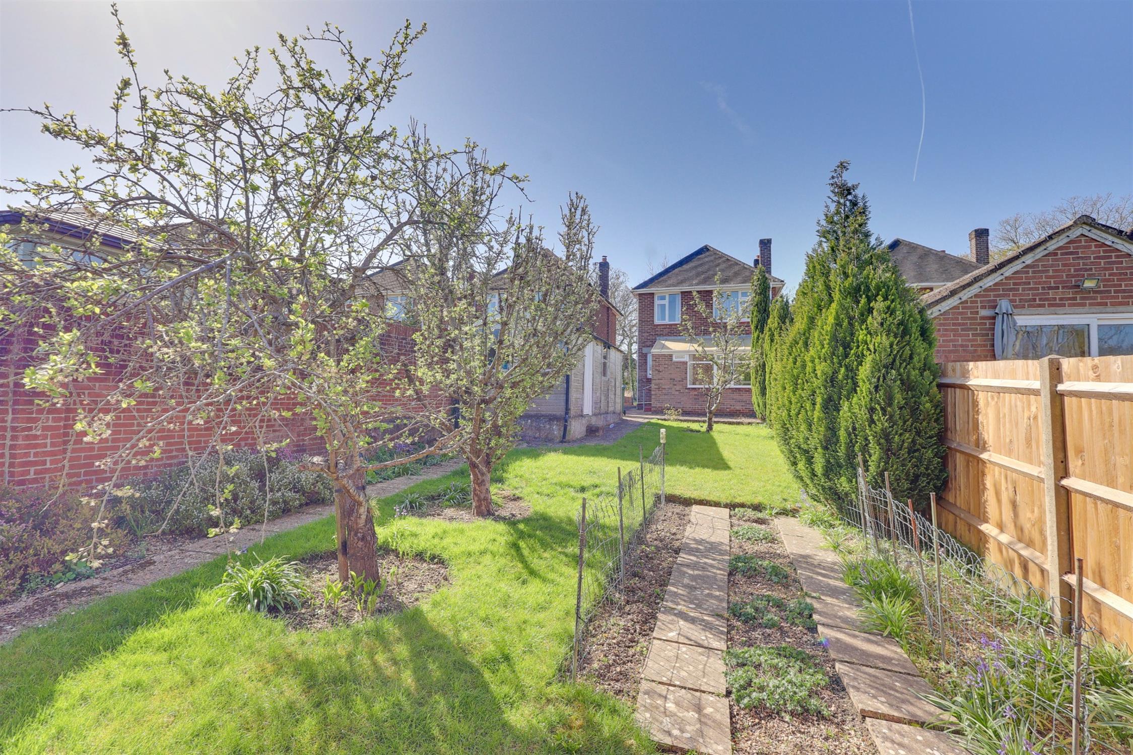 The garden is a true highlight, backing directly onto woodland and offering a high level of privacy and a peaceful outlook. Mainly laid to lawn, it also features two patio seating areas positioned at either end of the garden, making it perfect for outdoor dining and entertaining throughout the day. To the front, the property benefits from a low-maintenance garden, driveway parking and a detached garage measuring approximately 19 feet, providing excellent storage or workshop potential. Although some updating may be required, the property already benefits from gas central heating and double glazing, and is offered with no forward chain.