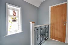 Smooth ceiling, double glazed obscured window to side, hatch providing access to loft space, doors to: