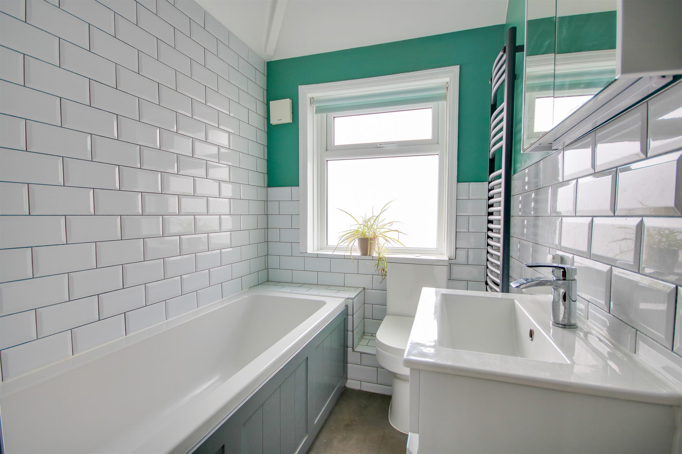 Smooth ceiling, double glazed obscured window to front, panel enclosed bath with shower over, wash hand basin, WC, tiling to principal areas, ladder towel rail.