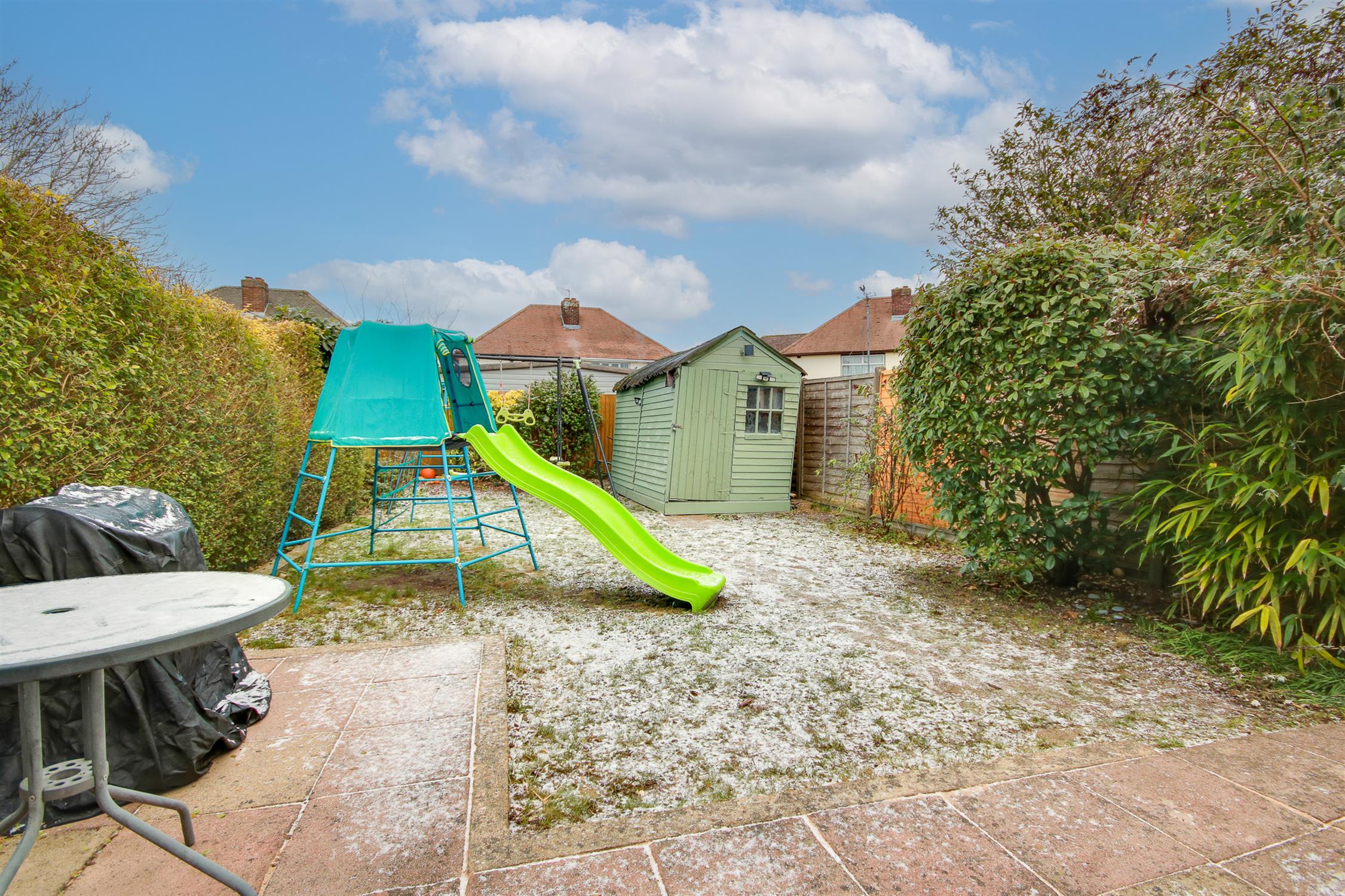 Fence enclosed rear garden, patio seating area, shed, side access.