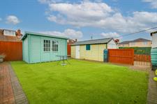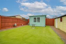 Fence enclosed rear garden with gated side access, artificial lawn, summer house.