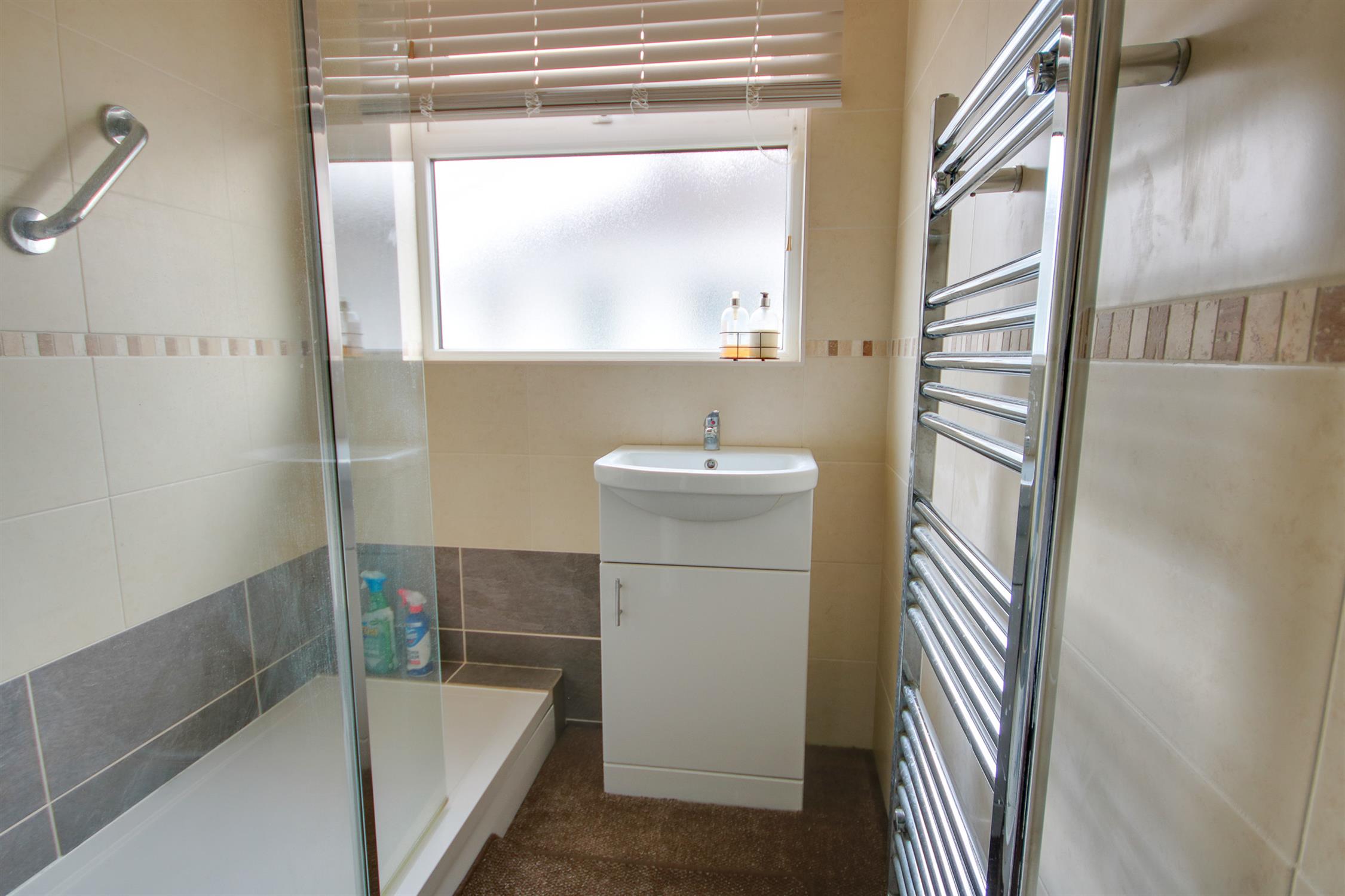 Coved and textured ceiling, UPVC double glazed obscured window to side, large shower tray with mains fed shower over, wash hand basin, heated ladder towel rail.