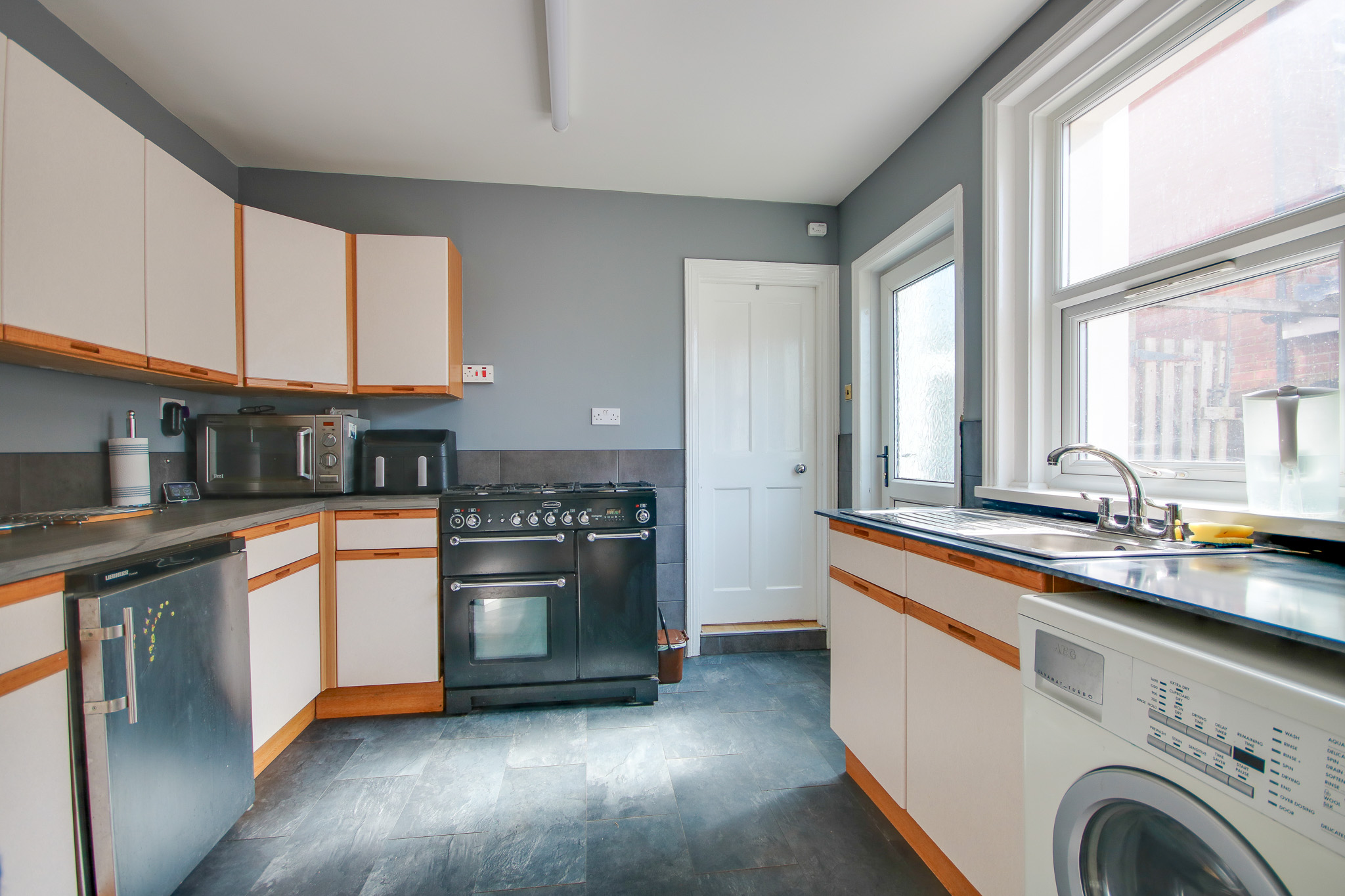 Smooth ceiling, double glazed window to side, double glazed door to side, a range of wall, base and drawer units with work surface over, sink and drainer inset, space for appliances, wall-mounted boiler, radiator, door to: