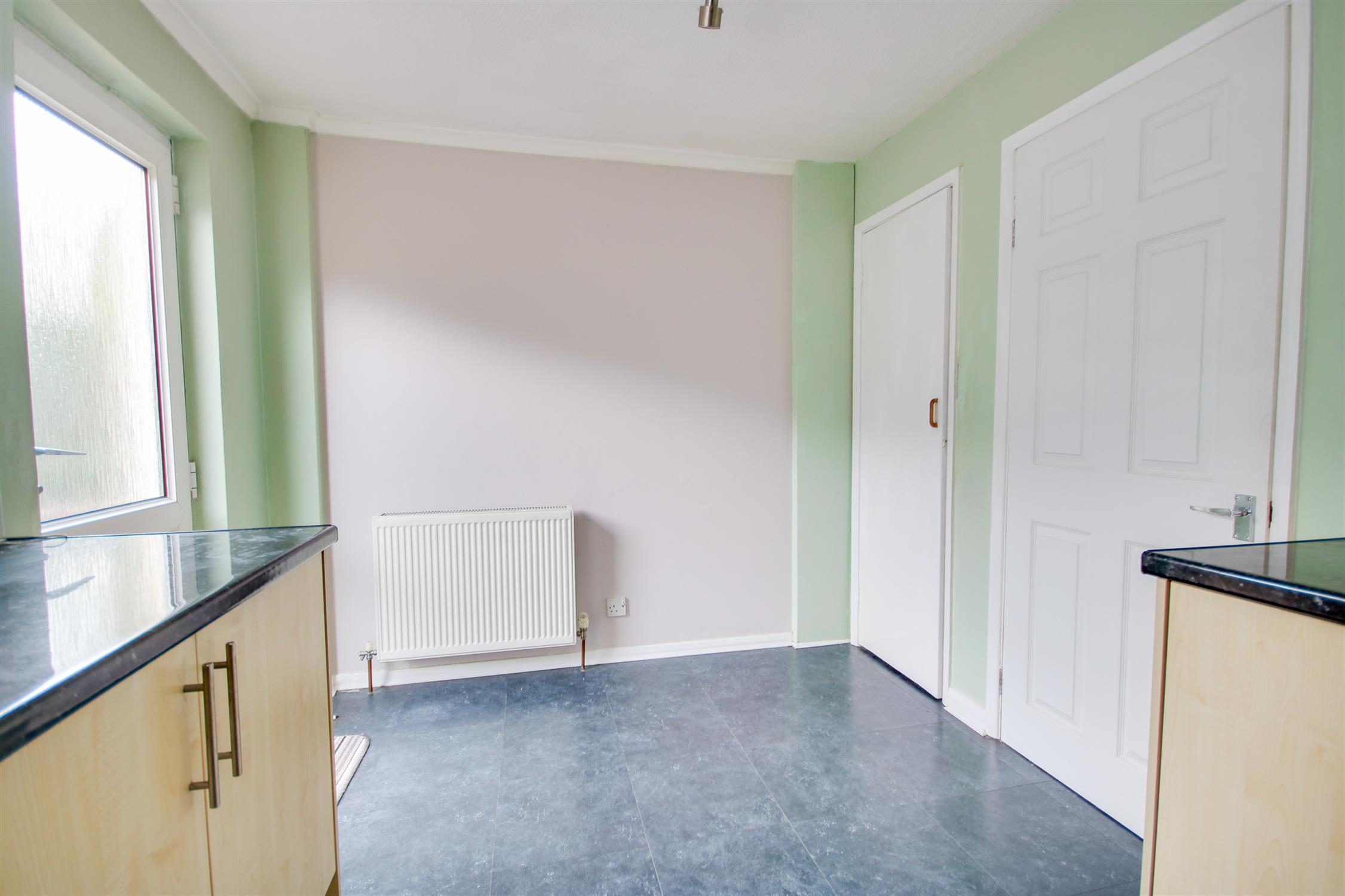 Textured and coved ceiling, double glazed door and window to rear, range of wall, base and drawer units with work surface over, stainless steel sink and drainer inset, space for fridge/freezer, washing machine and cooker, wall mounted boiler, tiled splash backs, storage cupboard, radiator.