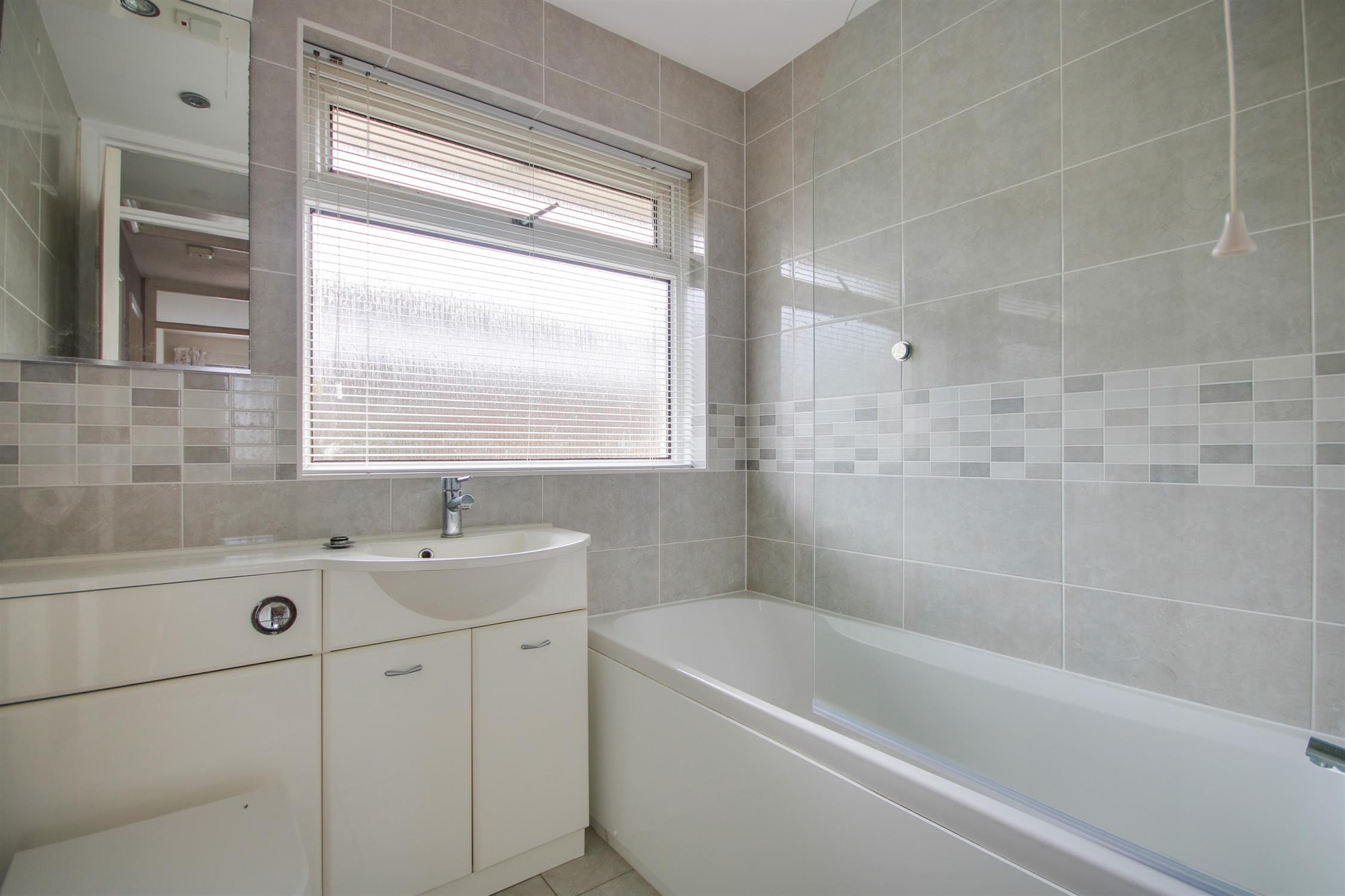 Smooth ceiling, double glazed obscured window to rear, panel enclose bath with shower over, WC, wash hand basin, radiator, tiled walls and floor.