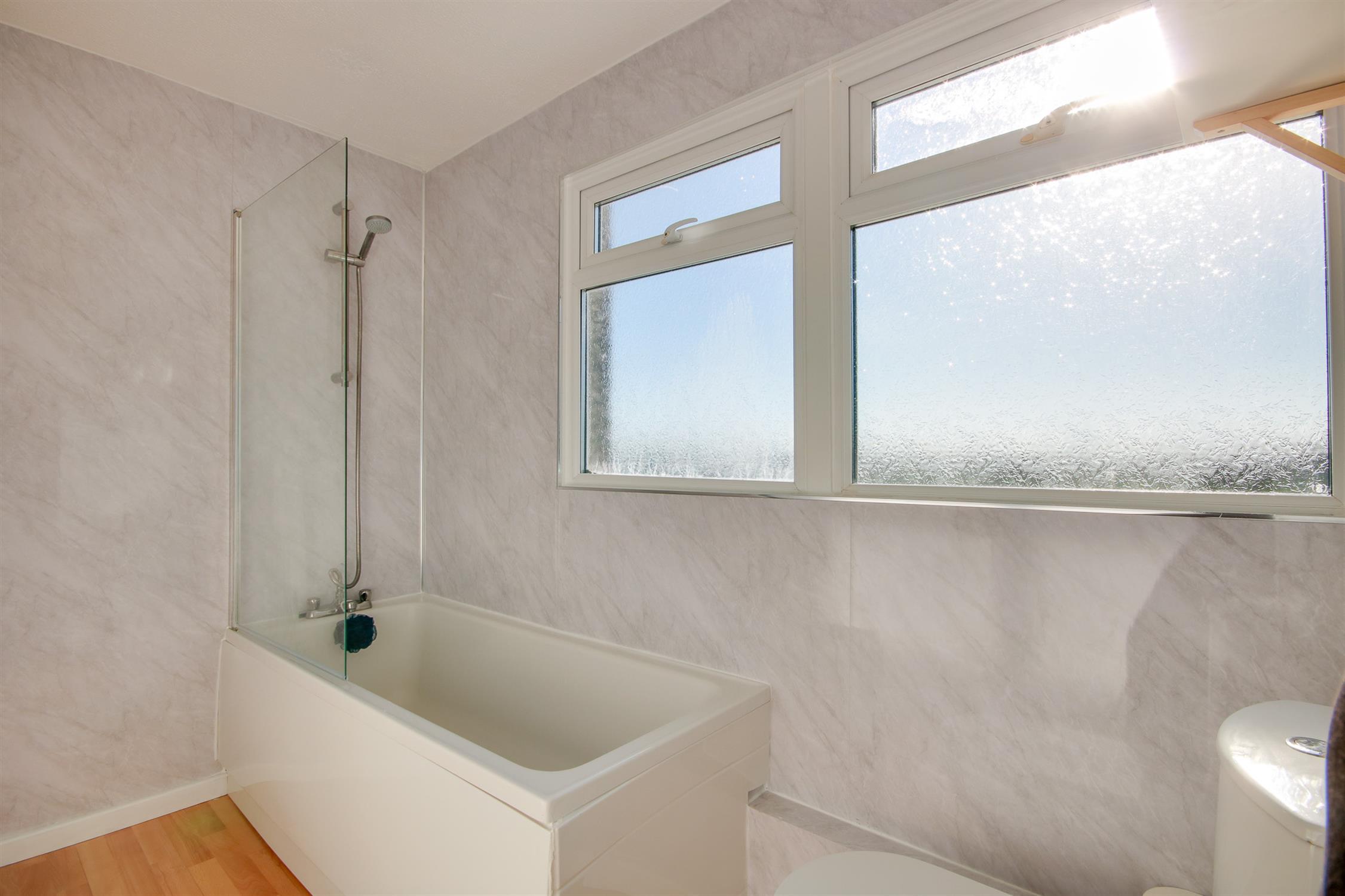 Textured ceiling UPVC double glazed obscured window to rear, WC, wash hand basin and panel enclosed bath with shower attachment, aqua panelling to principal areas, laminate floor.