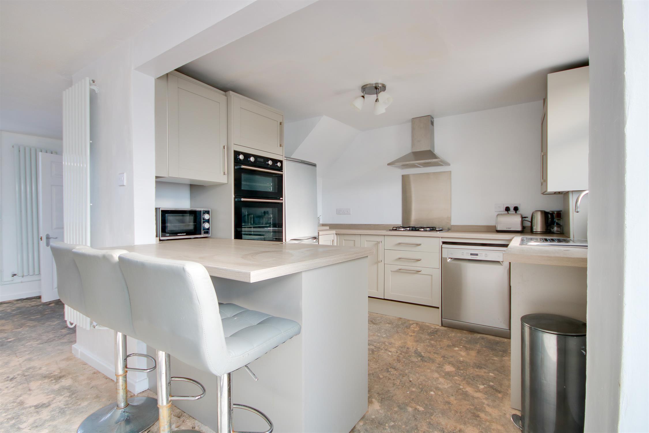 Textured ceiling to lounge/dining area, smooth ceiling to kitchen area, UPVC double glazed window to front and rear, UPVC double glazed French doors to rear, shaker-style wall, base and drawer units with work surface over, stainless steel sink and drainer inset, built-in oven, gas hob with extractor over, breakfast bar, space for appliances, two vertical radiators.
