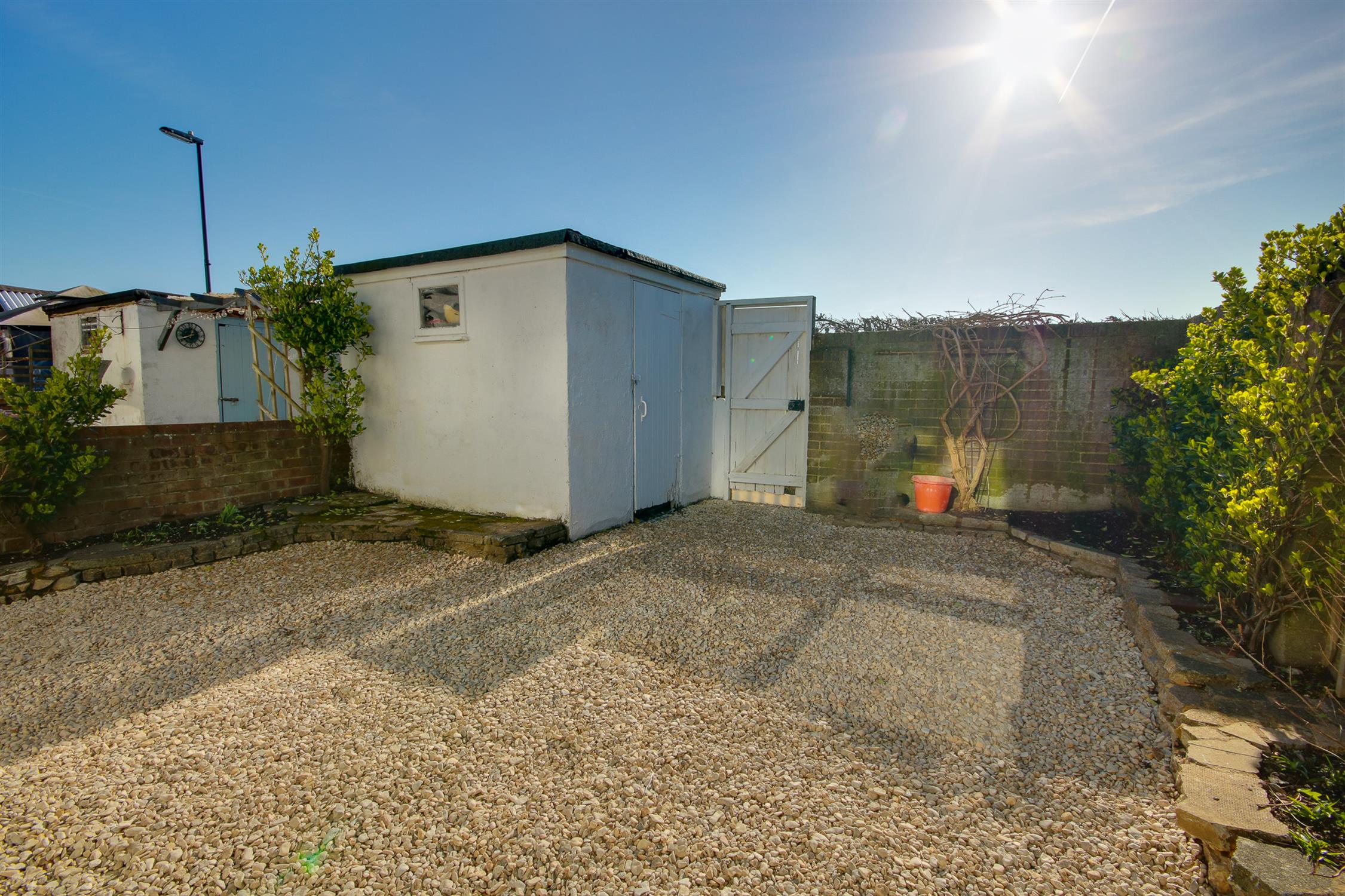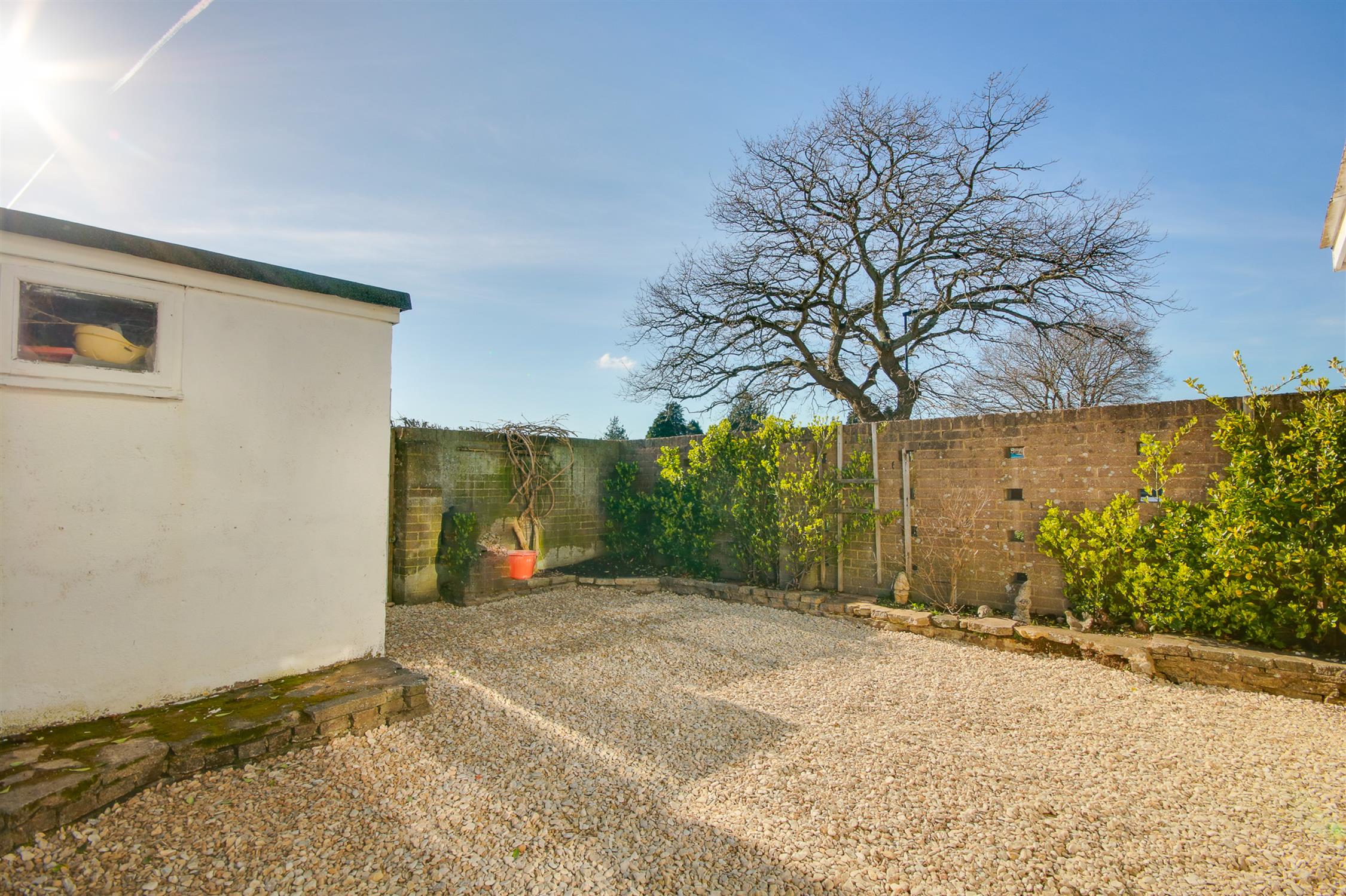 Wall enclosed rear garden with a good degree of privacy, decorative stones, flower and shrub borders, shed, gated rear access.