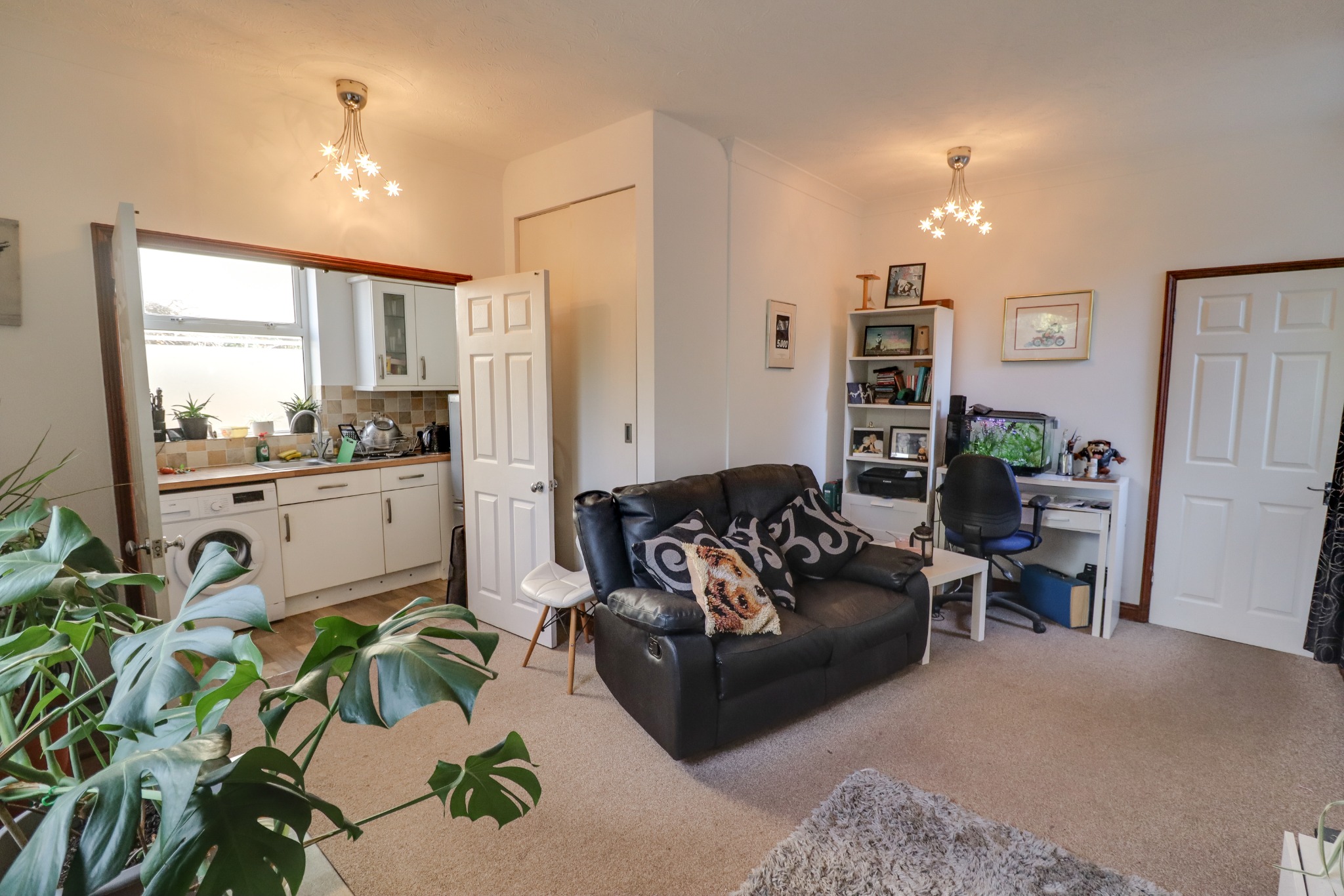 Textured finish to coved ceiling, double glazed windows to rear and side elevation, storage cupboards, wall mounted combi boiler, radiator, double doors to: