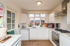 Range of fitted modern units to base & eye levels, work surfaces with inset sink unit, space for dishwasher and fridge, double glazed window to side elevation, door to: