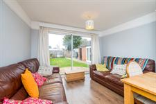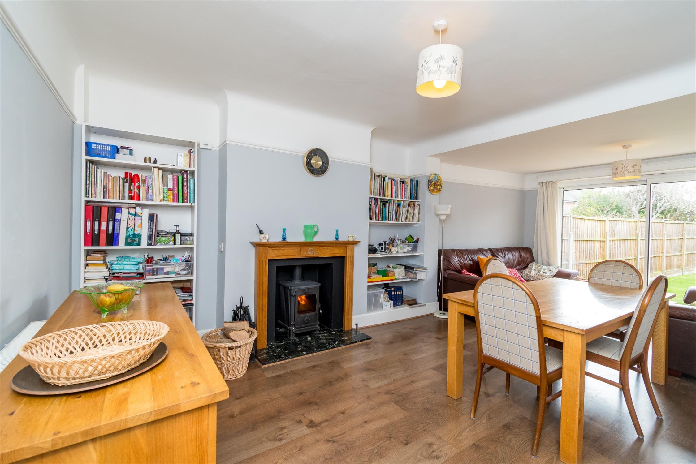 Feature fireplace with log burner, radiator, patio doors onto garden, opening into: