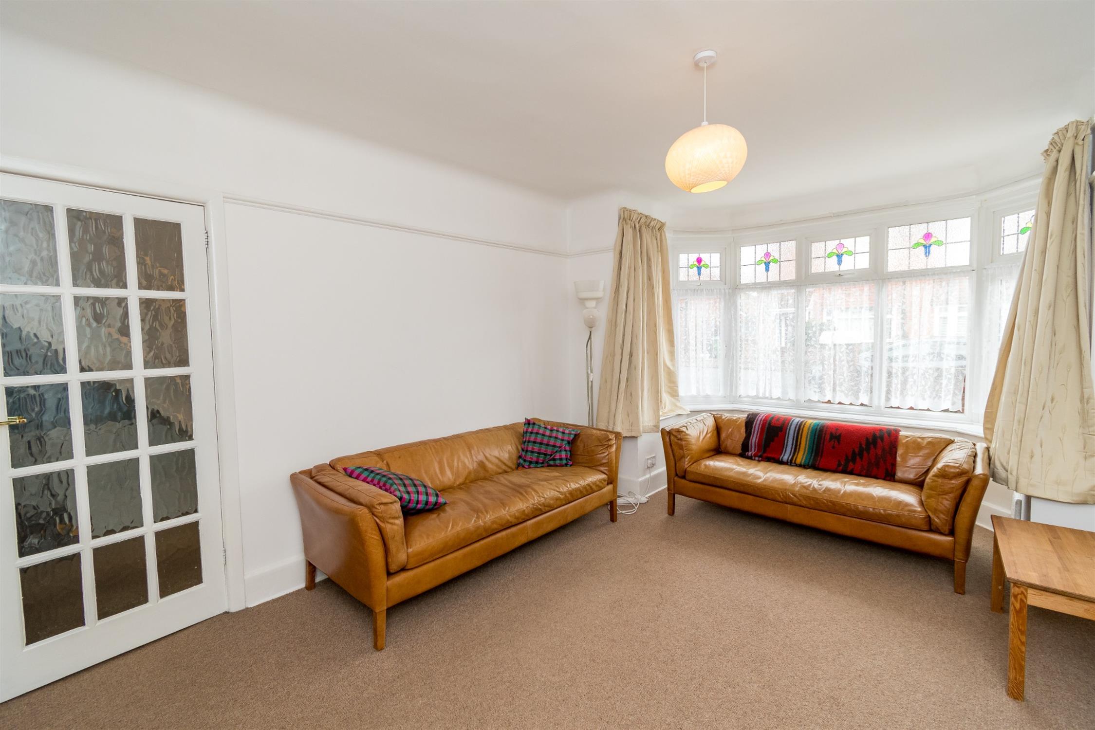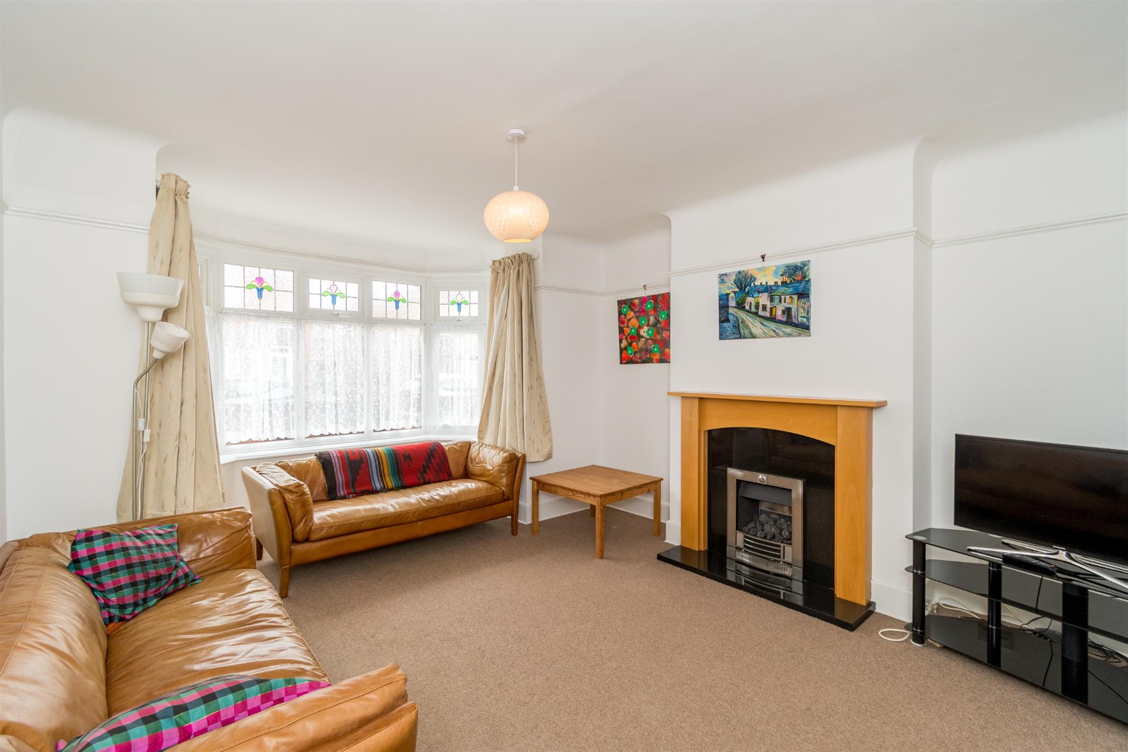 Feature fireplace & gas fire, picture rail, radiator, double glazed bay window to front elevation.