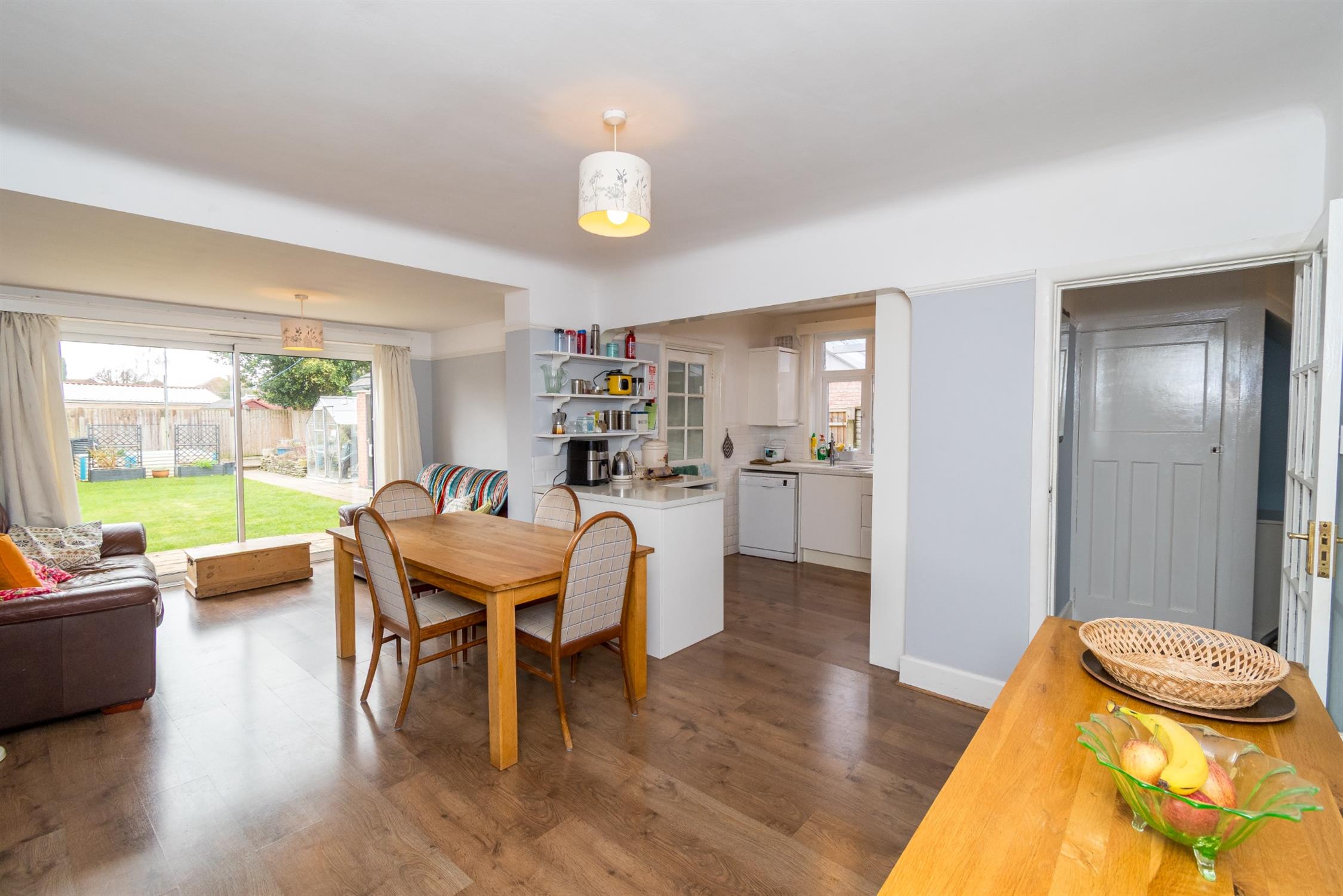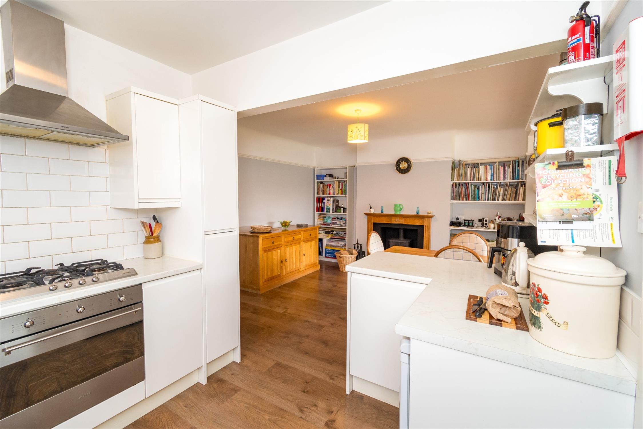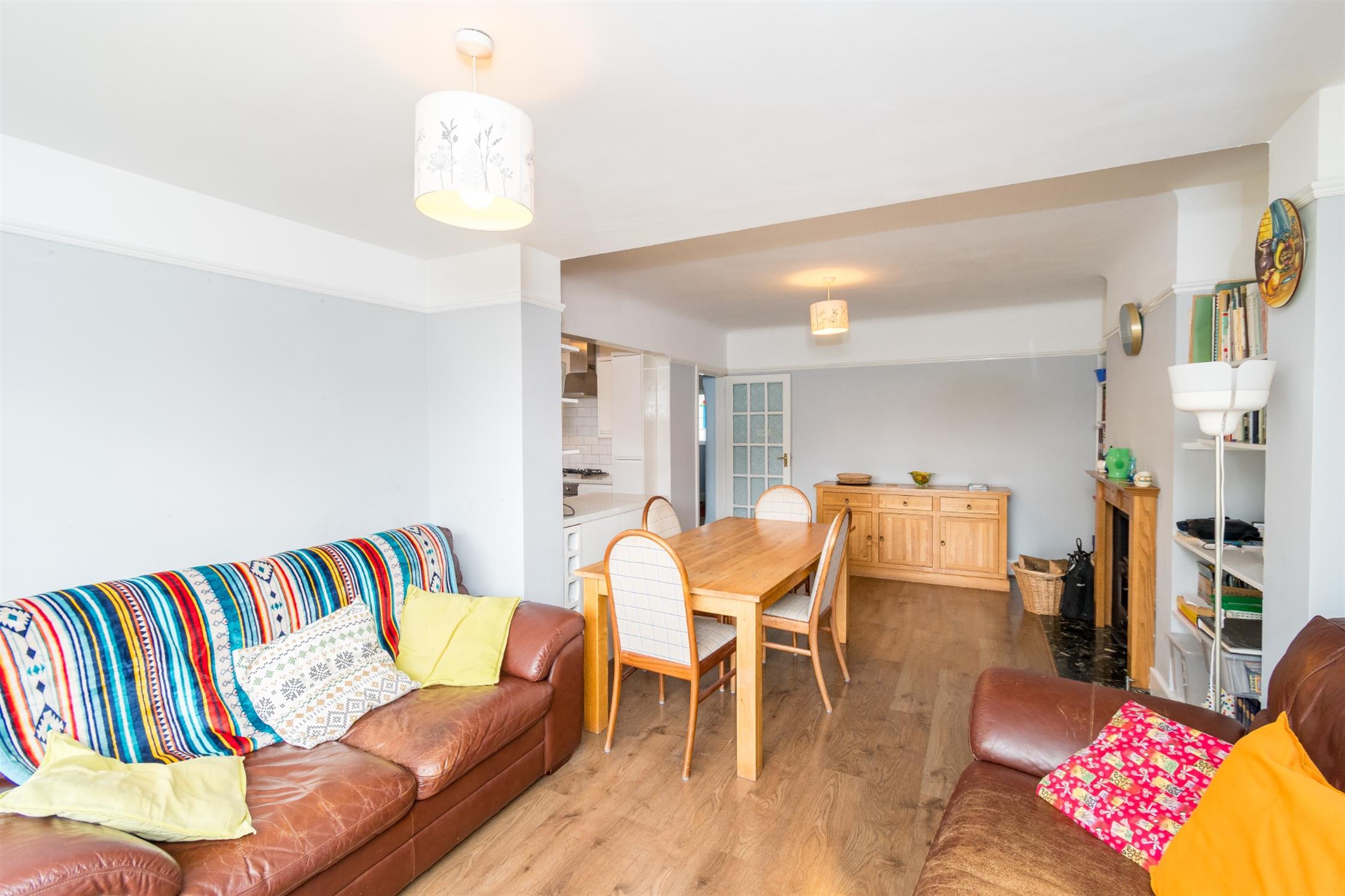 To the rear, the heart of the home is a stunning open plan kitchen/dining/family room, ideal for entertaining and everyday family life. The kitchen is fitted with sleek white units, with room for appliances, and ample worktop space. the dinning area has ample room for a large dining table and has a log burner. The sitting area opens out through sliding doors to the rear garden, creating a seamless indoor-outdoor living experience.