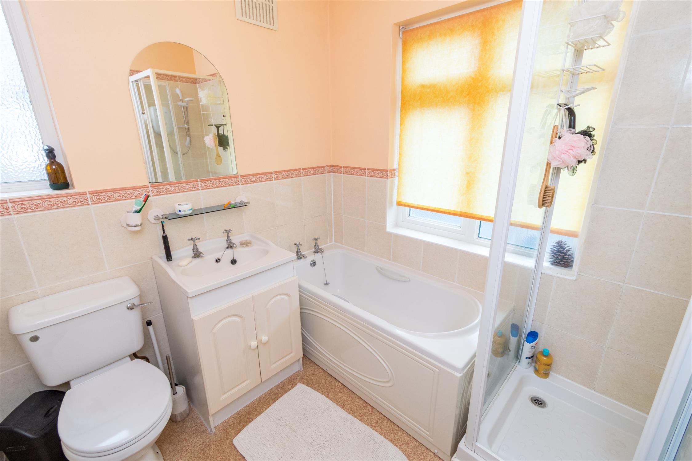 Four piece with panel enclosed bath, pedestal wash hand basin, low level wc & separate enclosed shower cubicle, heated towel rail, double glazed windows to front & side elevation.